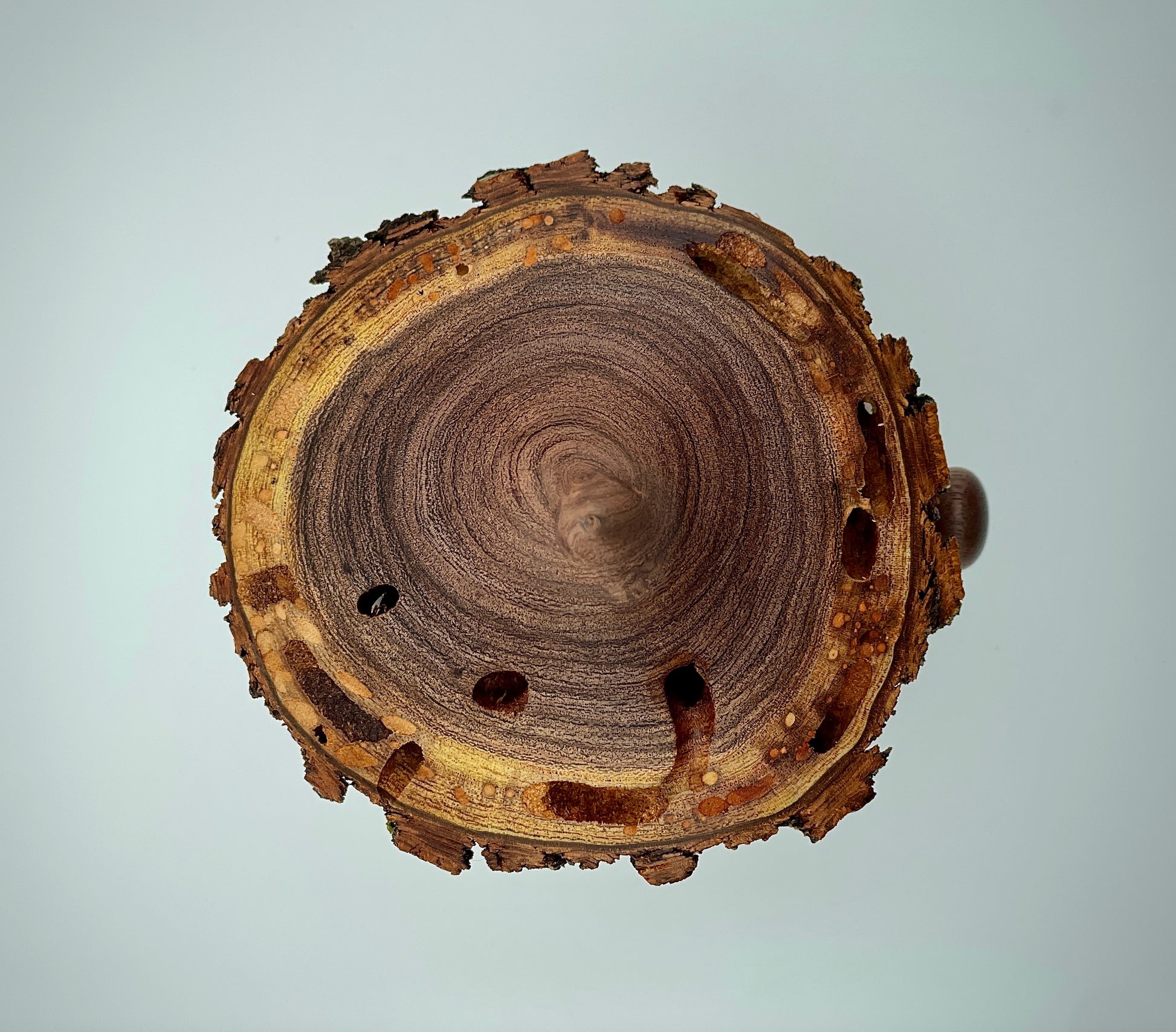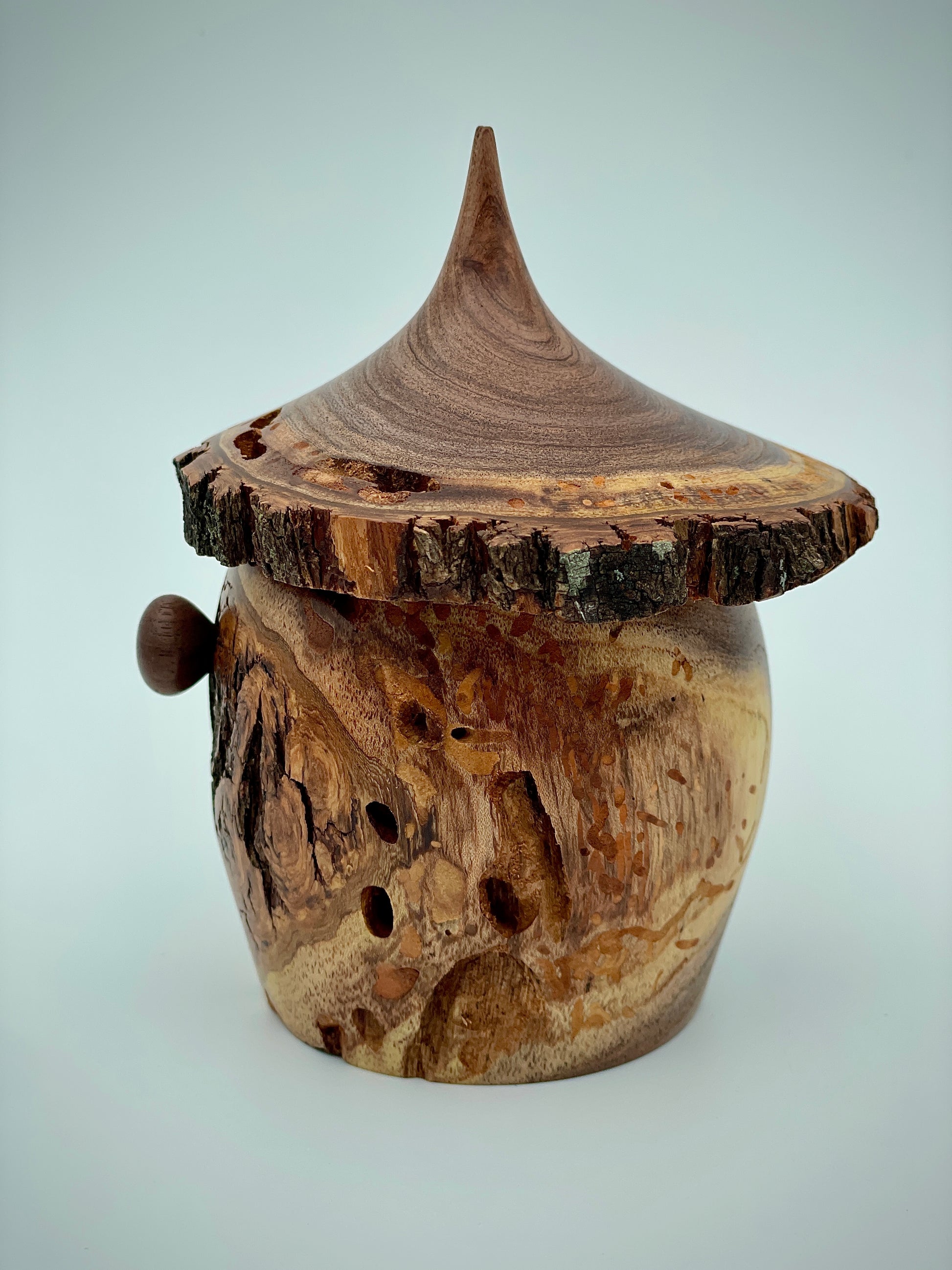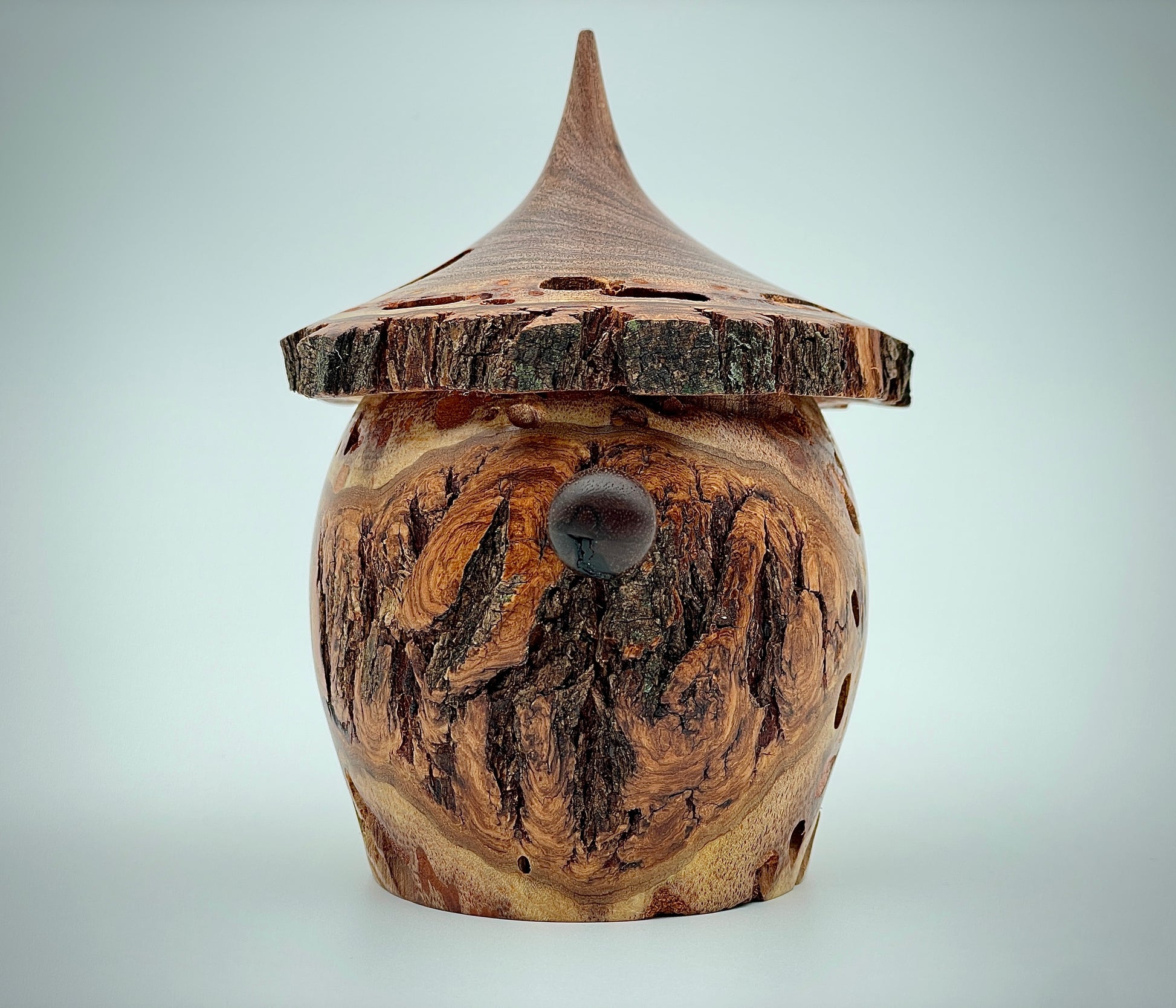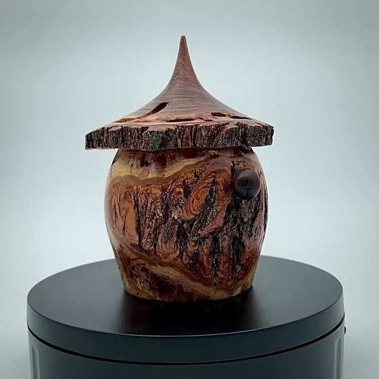 The Bark-faced Gnome, measuring 4.5 inches tall and 3.5 inches wide, is crafted from mesquite wood, showcasing a unique bark face and a live edge hat. Its distinctive design adds a touch of character to any setting, making it an excellent choice for enhancing natural aesthetics in home decor.