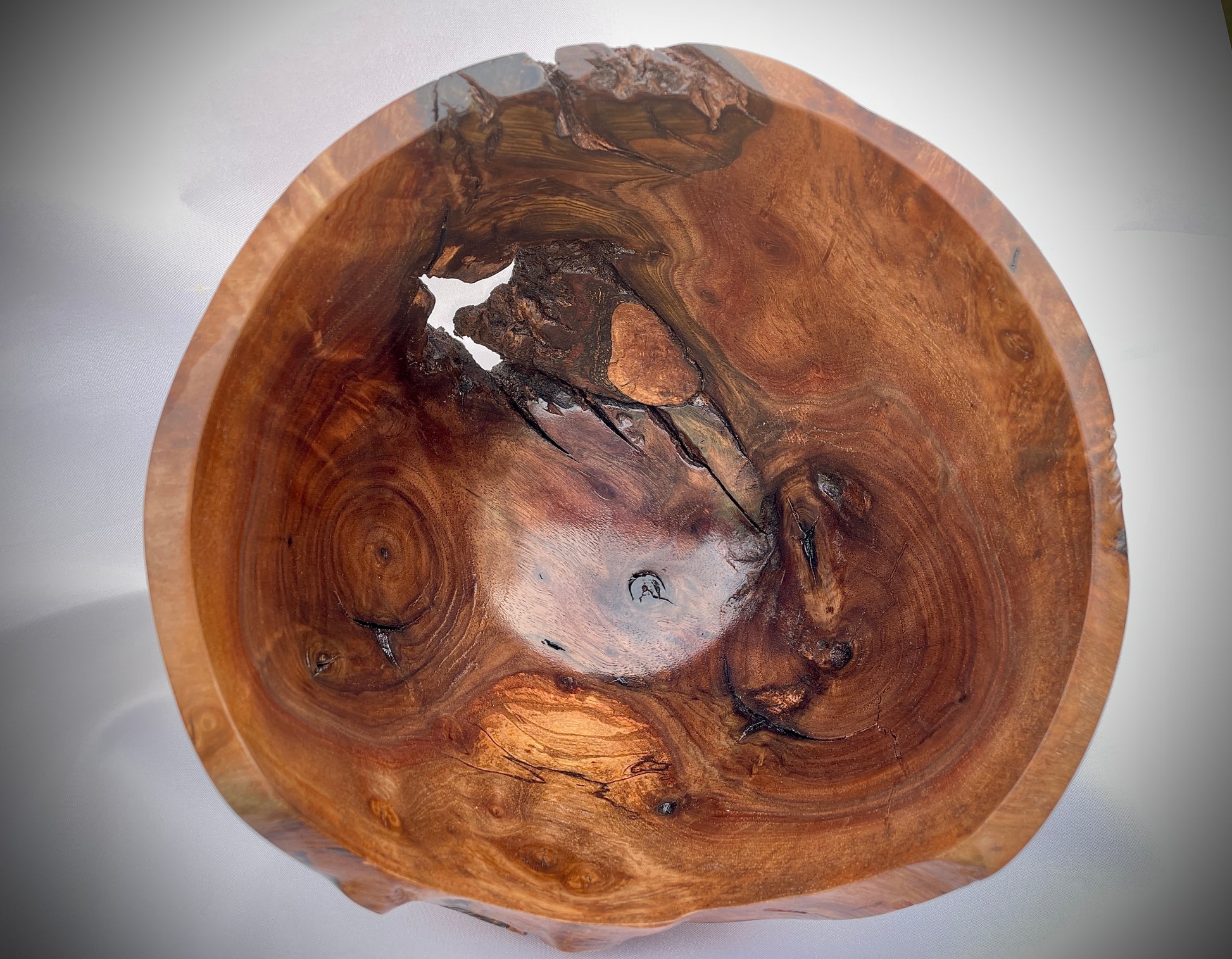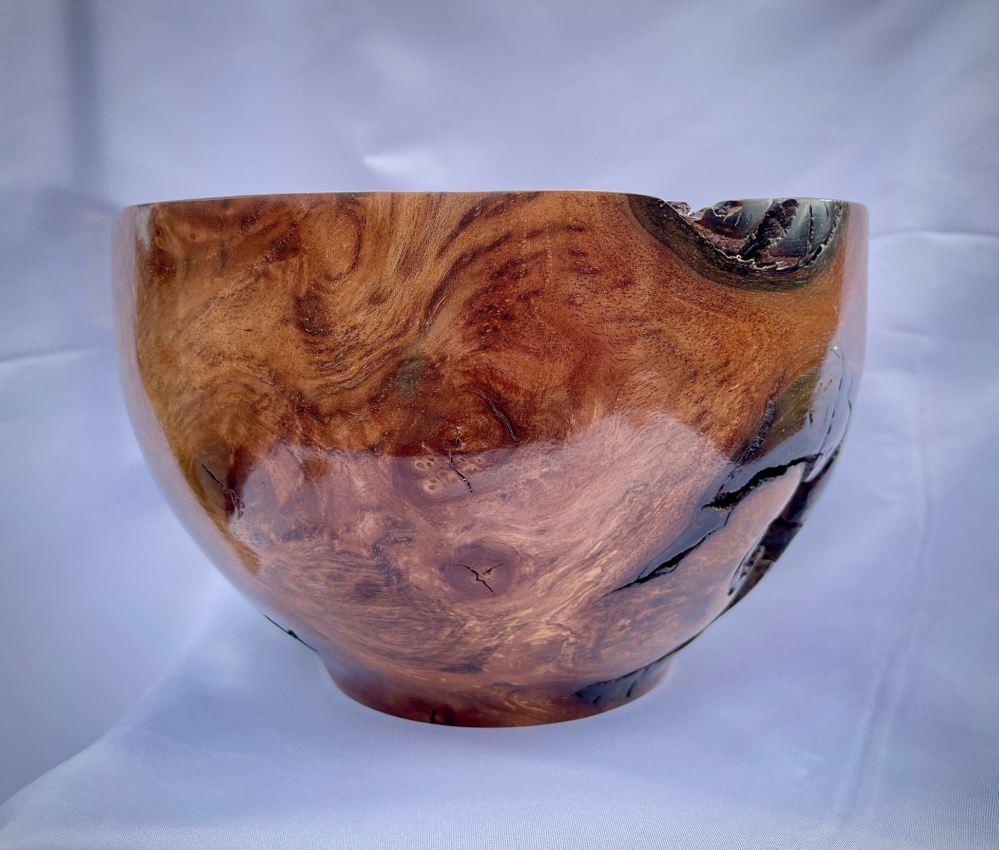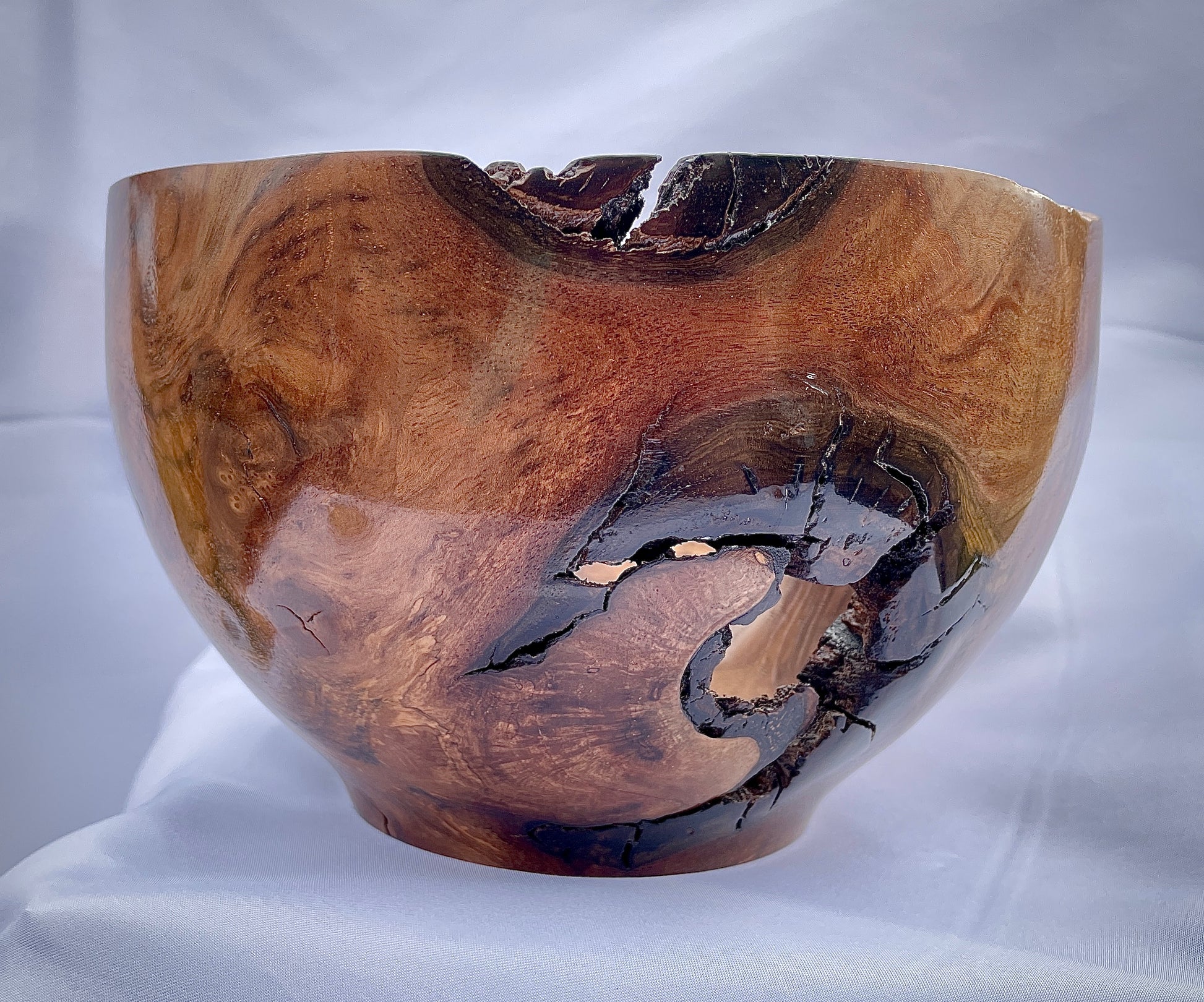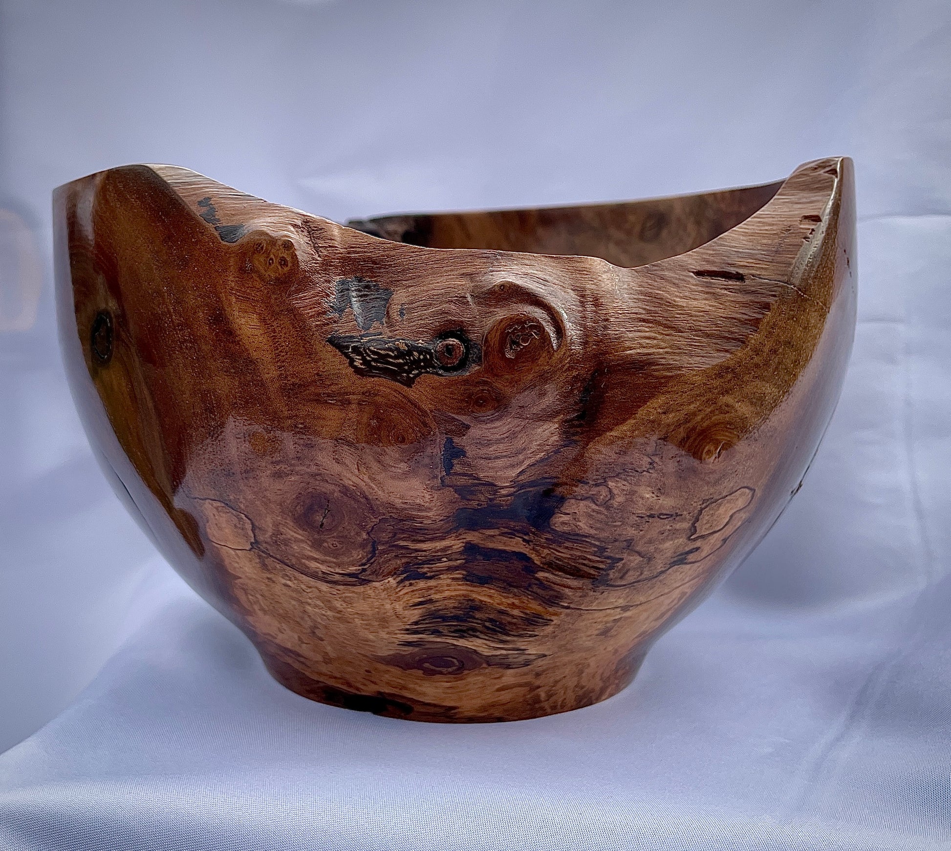 This stunning black walnut burl bowl is a dazzling addition to any home. Measuring 7" wide by 4.5" high, it showcases the magnificent grain pattern and unique natural features of burled wood. The natural edge rim and bark inclusions only add to its beauty.