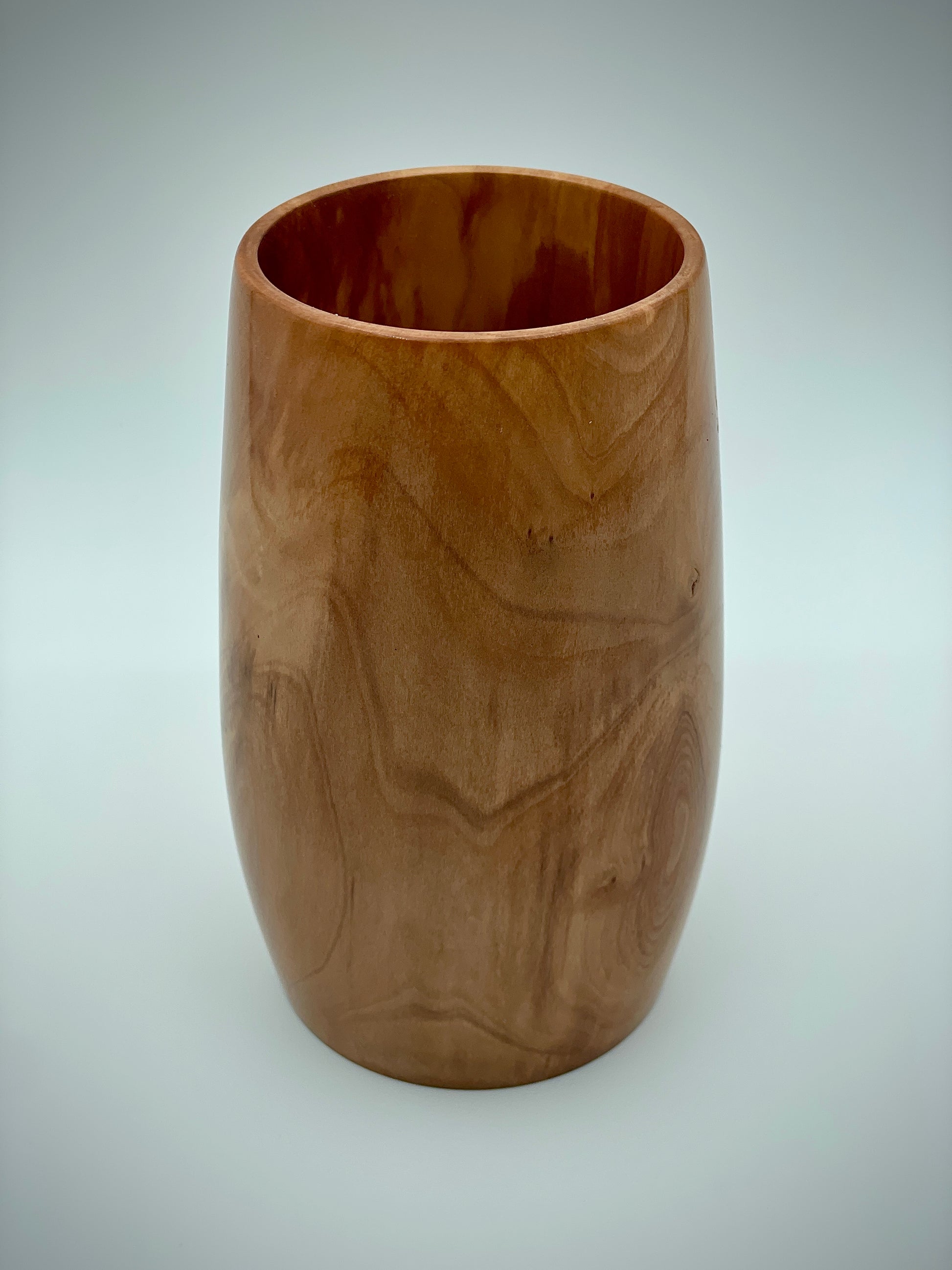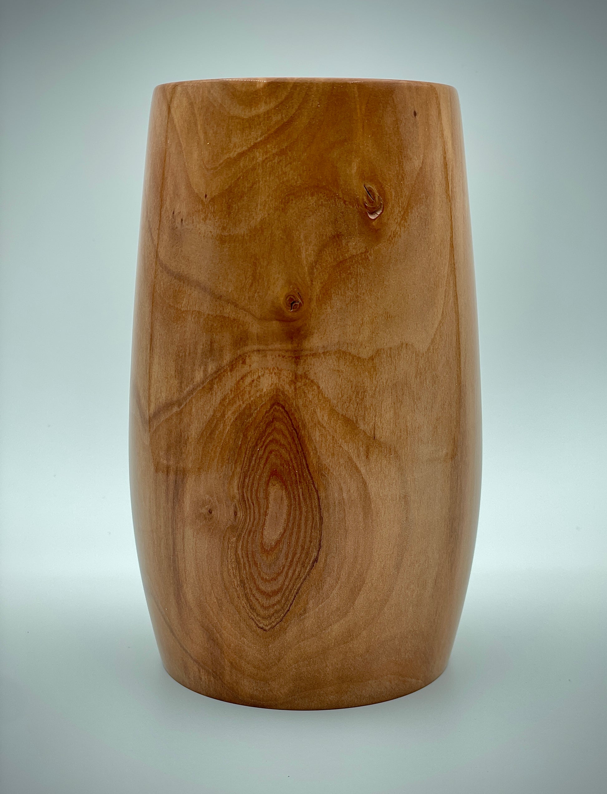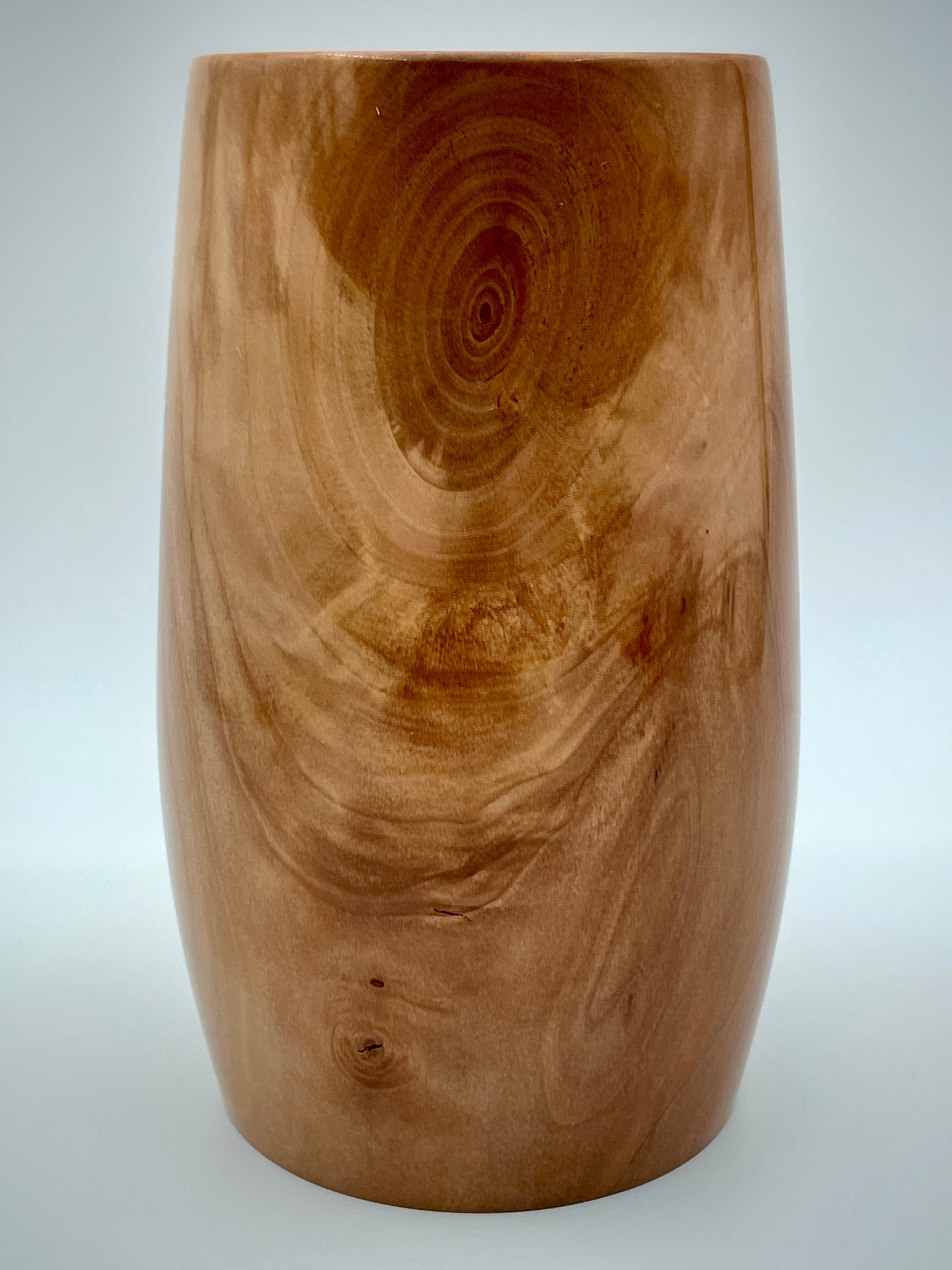 This Bradford pear vase combines natural beauty with craftsmanship, showcasing a rich, warm color and a striking grain pattern enhanced by a high gloss finish. Measuring 6" tall by 3.5" wide, it’s the perfect decorative accent to bring warmth and elegance to any room.