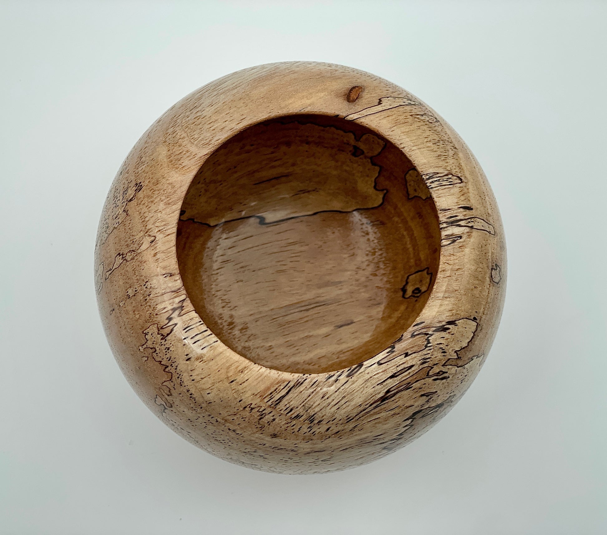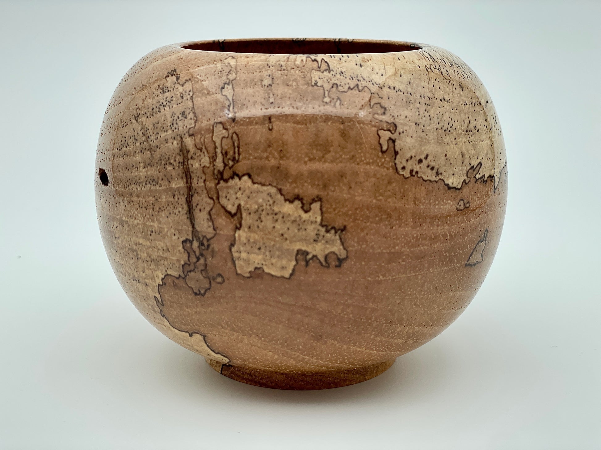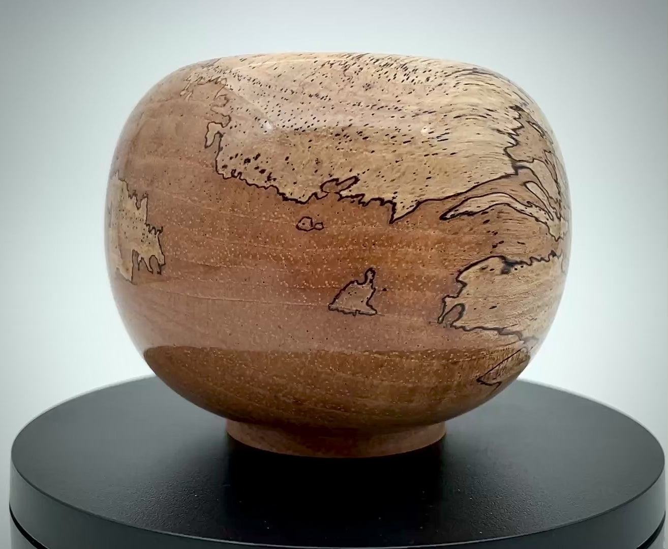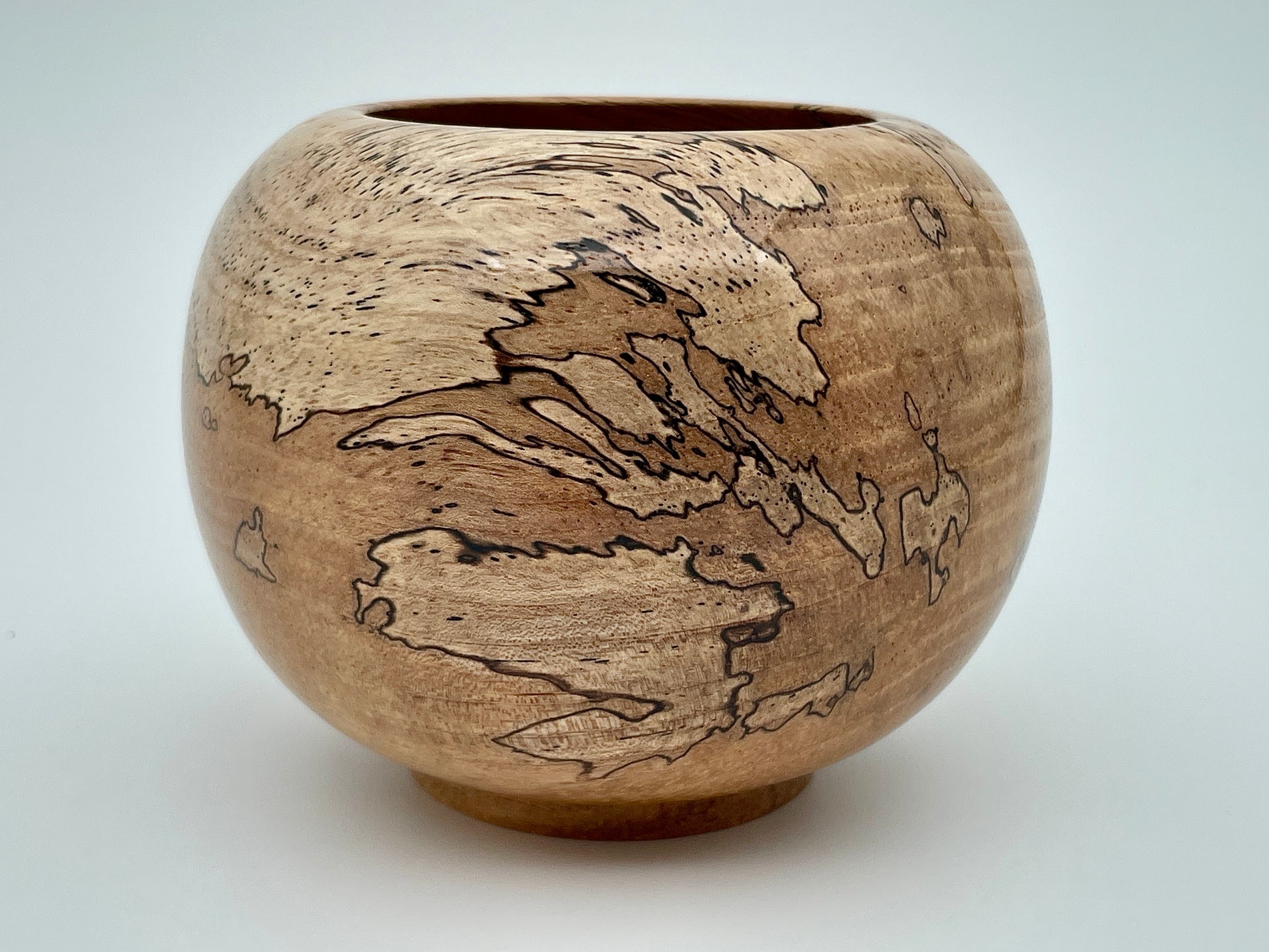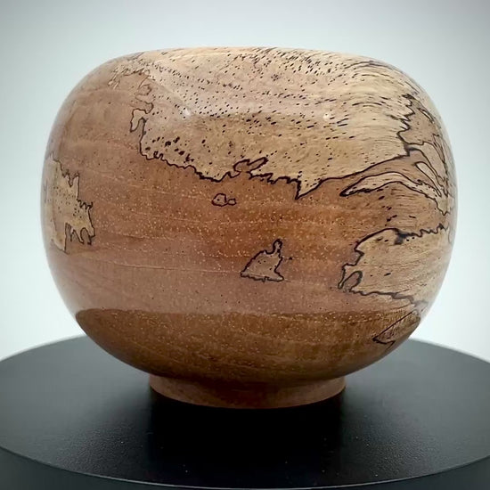 The Globe vessel, crafted from spalted pecan, stands 3 inches tall and 3.75 inches wide. Its decorative design features intricate patterns that resemble an antique map, enhancing both aesthetic appeal and historical resonance. This unique piece not only serves as a striking decorative element but also reflects craftsmanship rooted in nature.