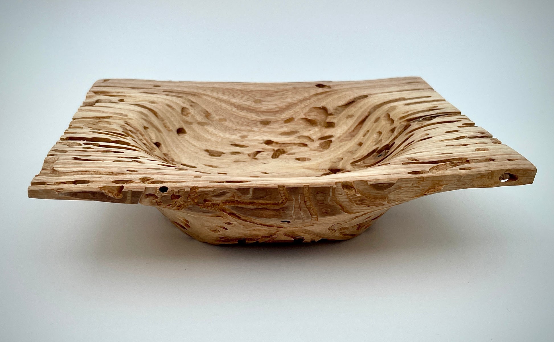 This decorative winged square bowl is crafted from honey locust wood, showcasing the unique character of the material. With a height of 1.5" and width of 6", it makes for a stunning addition to any home decor. Experience the rich beauty of honey locust with this one-of-a-kind bowl.