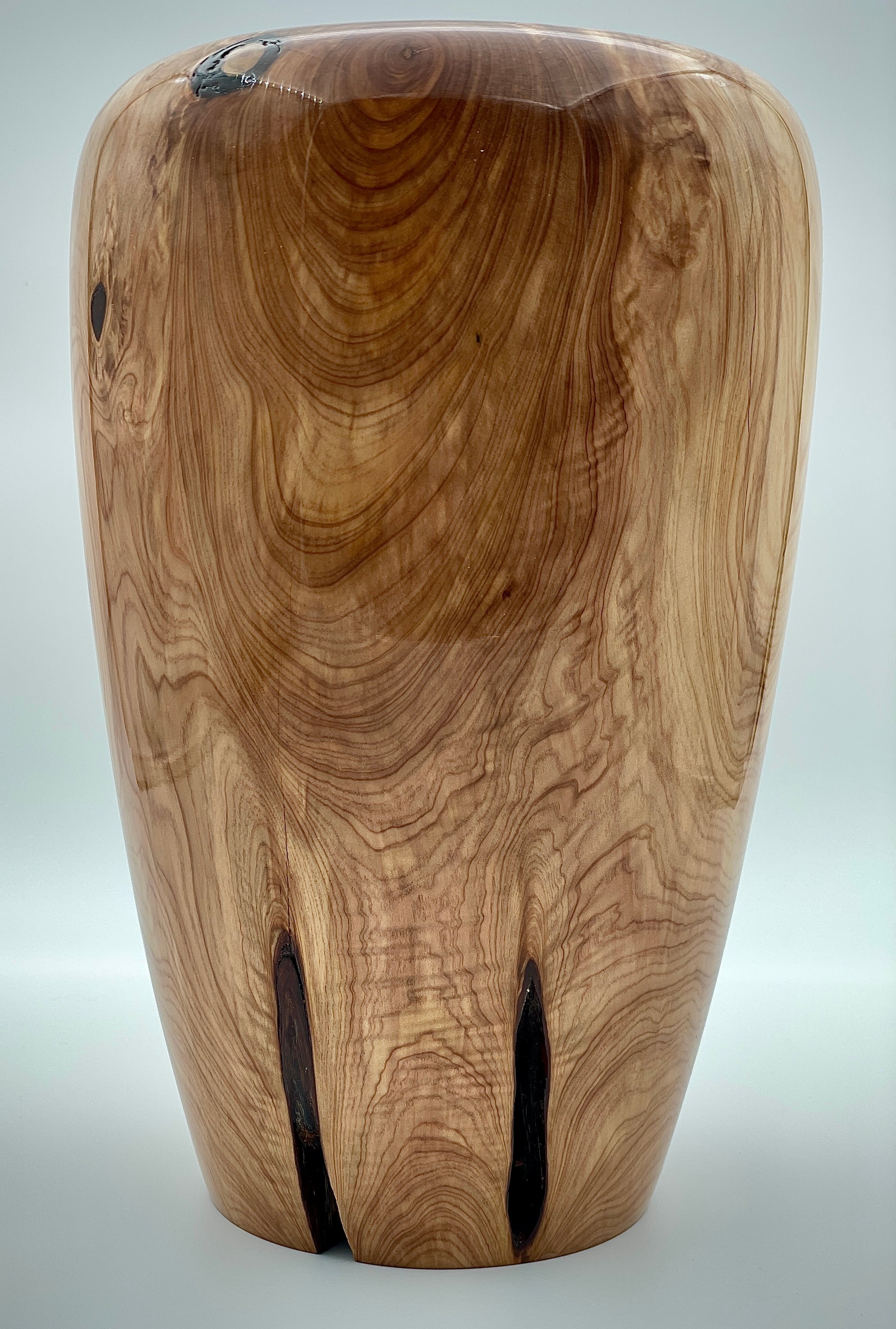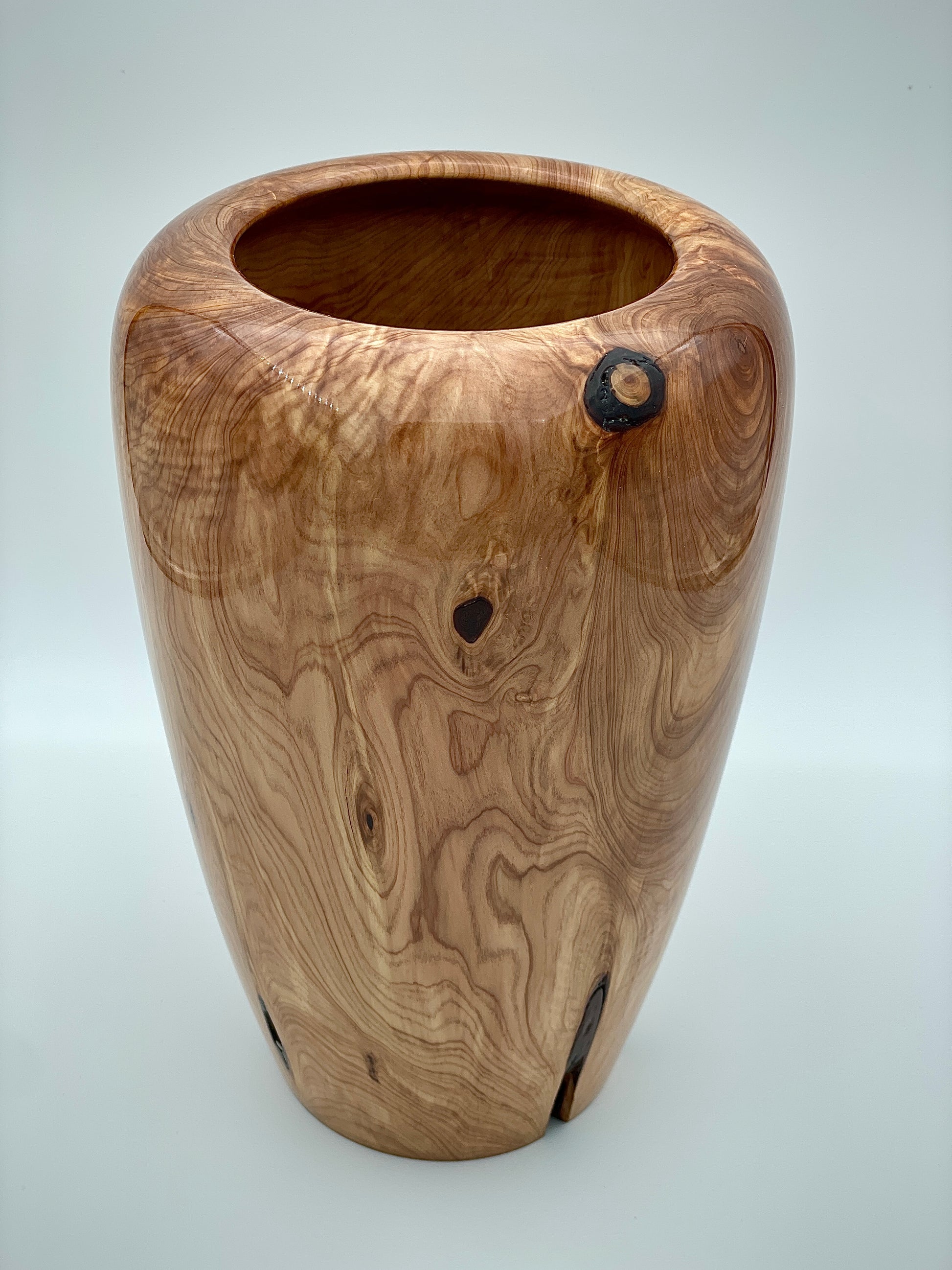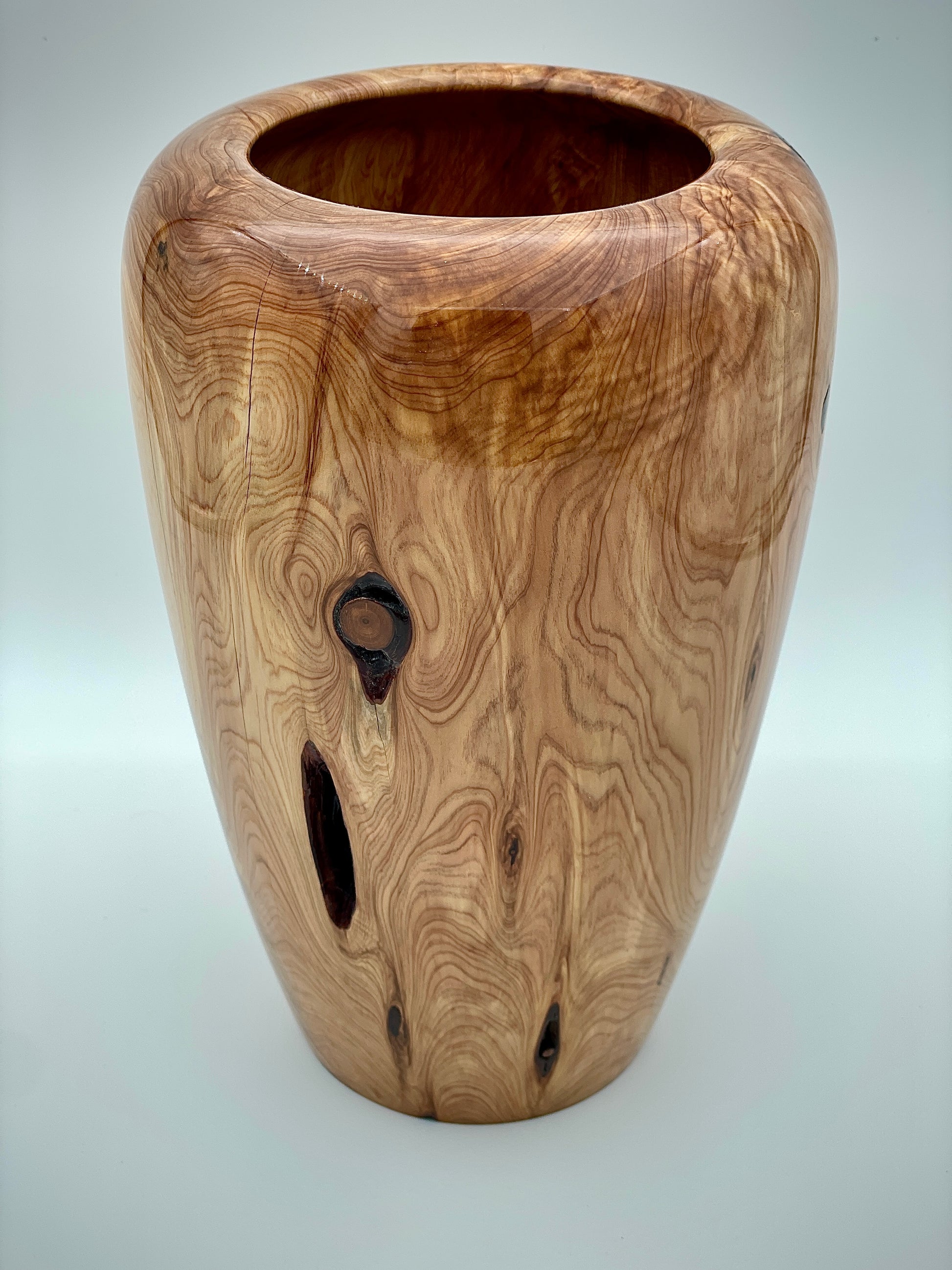 This large decorative vase, crafted from exquisite Texas cedar, stands 9" tall and 6" wide. Its high gloss finish accentuates the wood’s beautiful natural character and showcases a stunning grain pattern, making it a refined addition to any elegant interior.