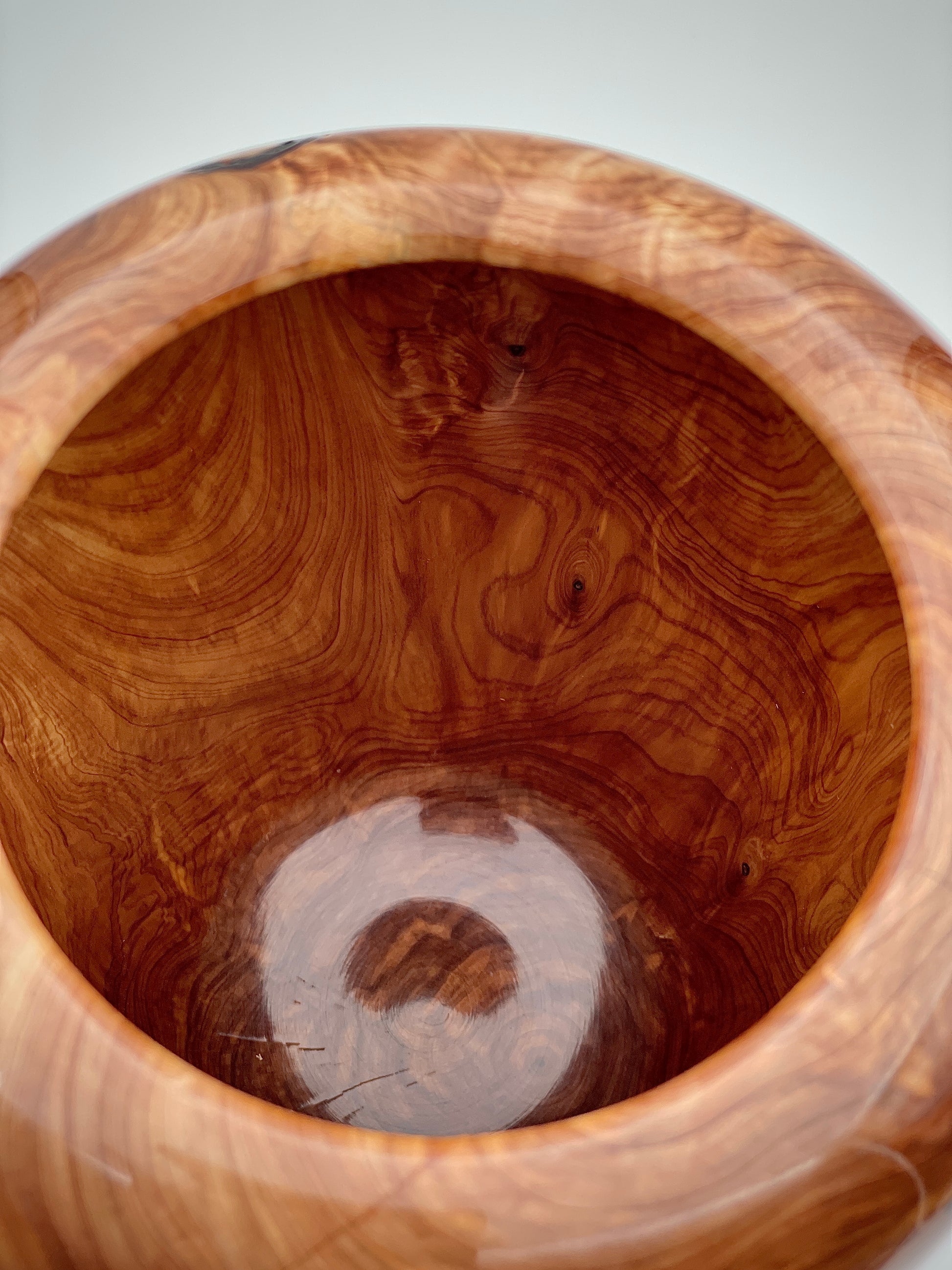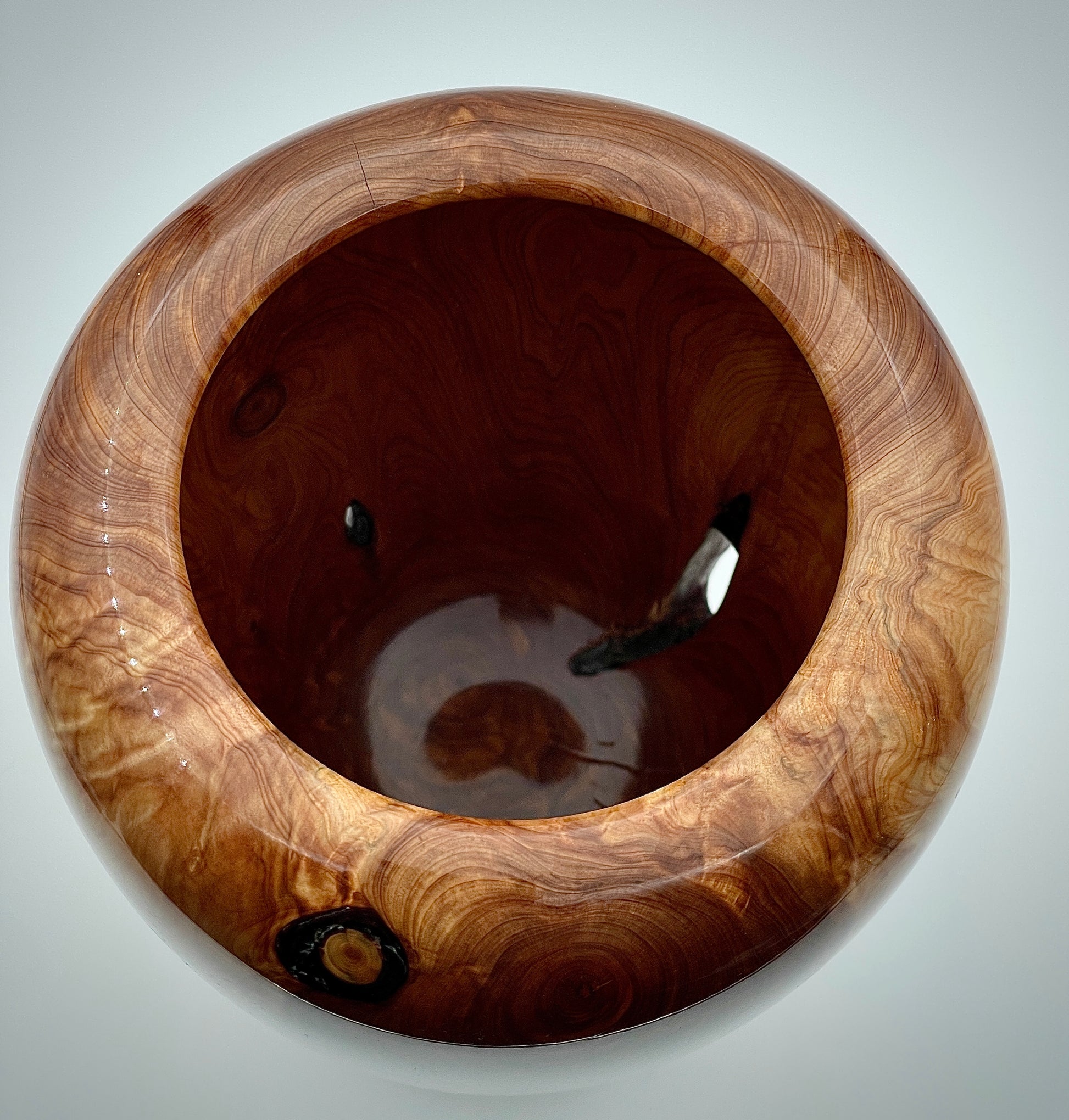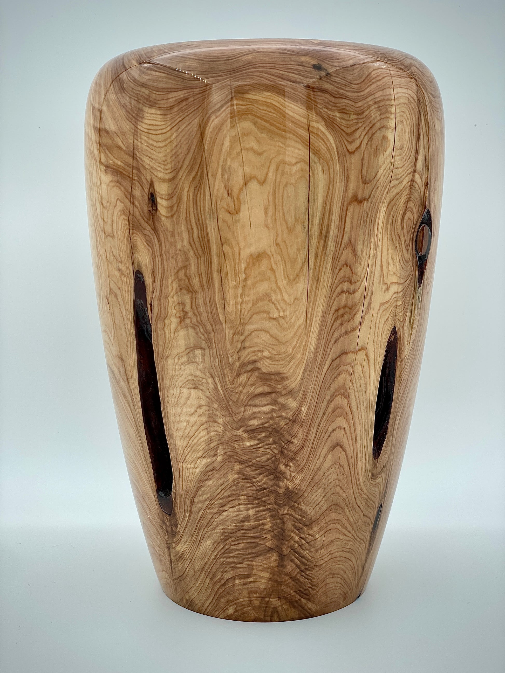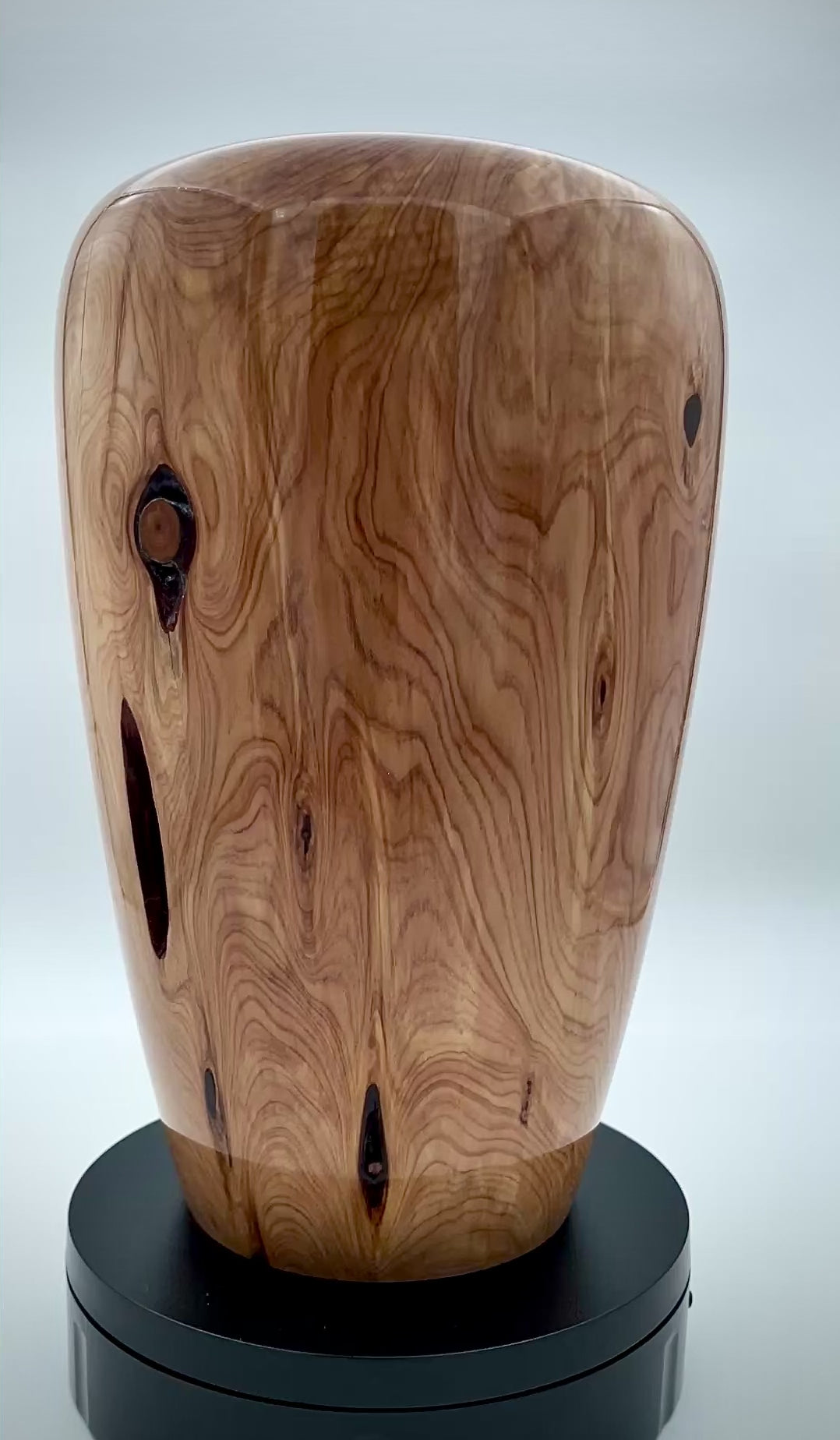 This large decorative vase, crafted from exquisite Texas cedar, stands 9" tall and 6" wide. Its high gloss finish accentuates the wood’s beautiful natural character and showcases a stunning grain pattern, making it a refined addition to any elegant interior.