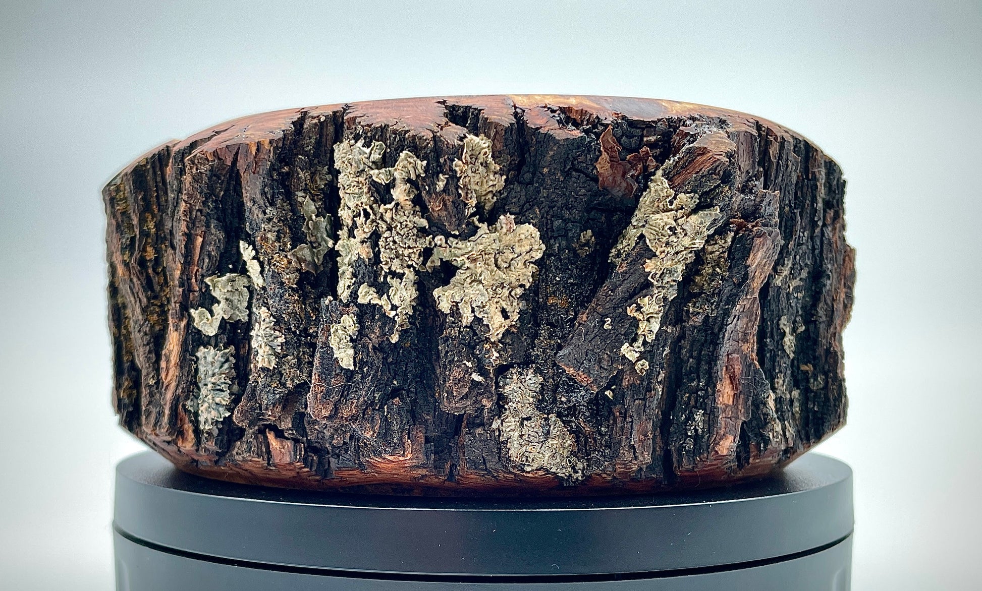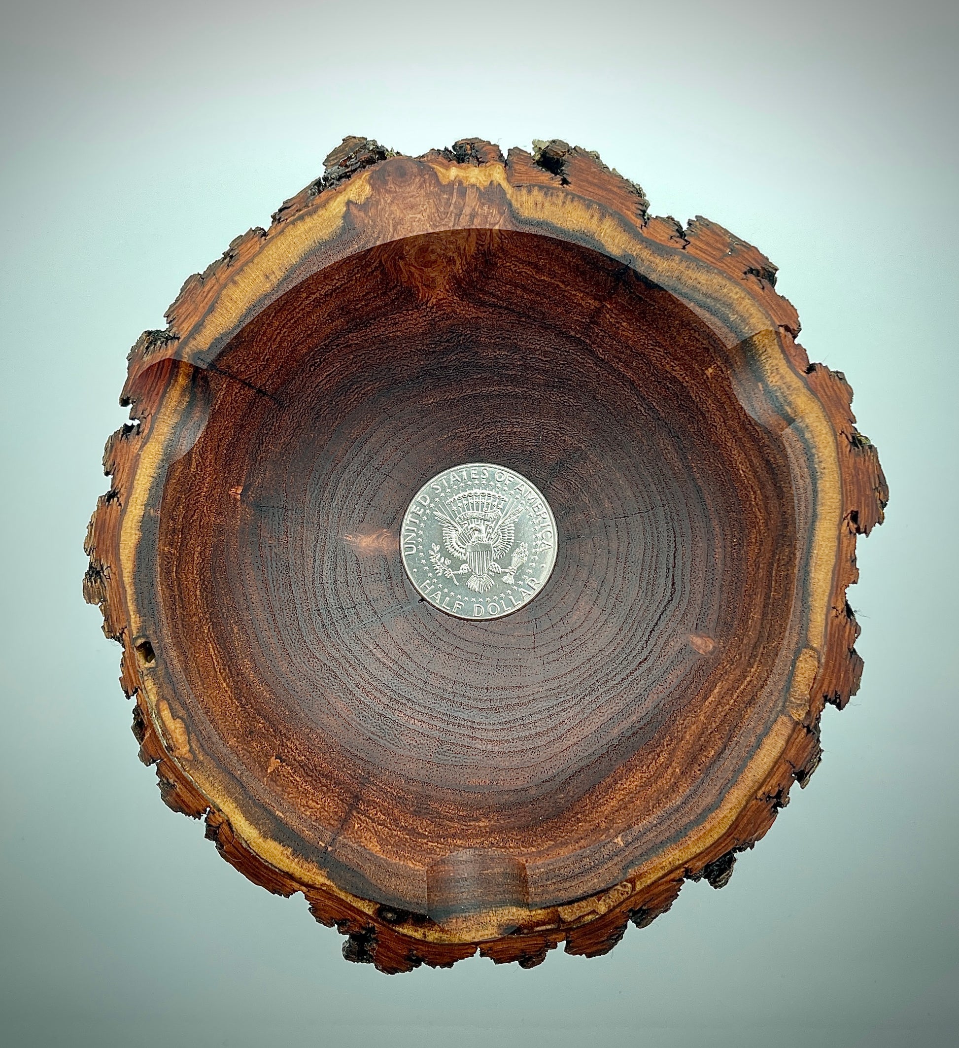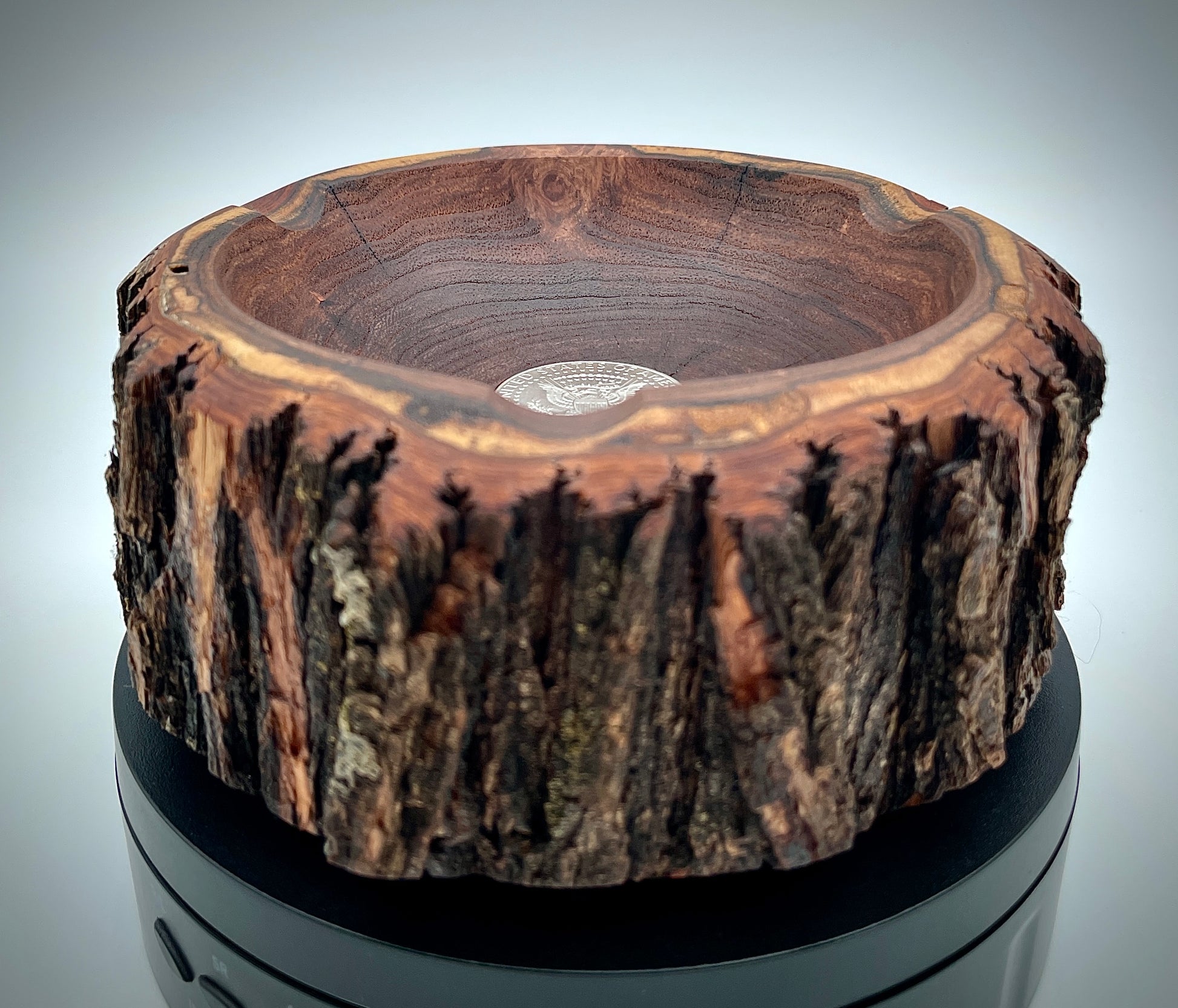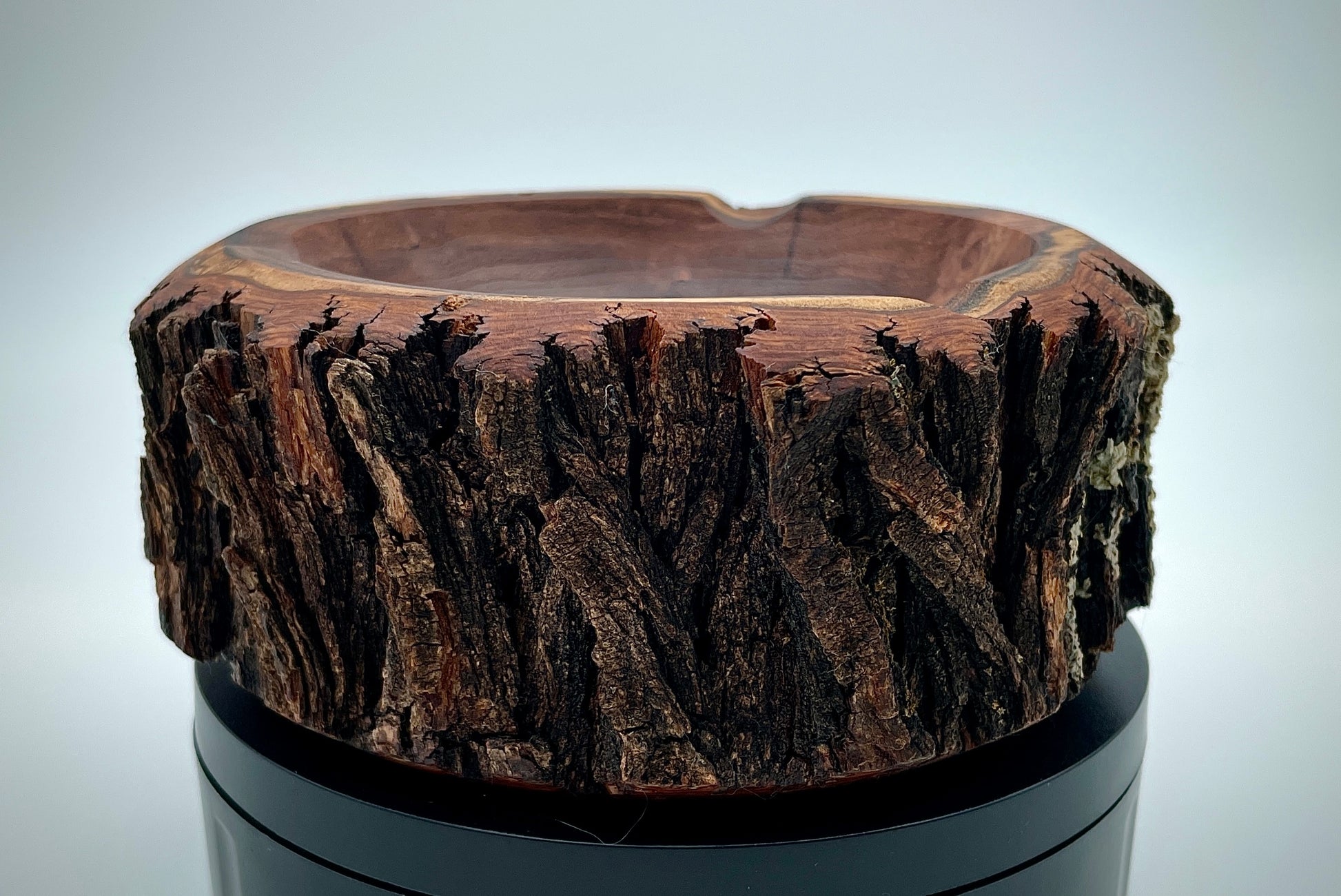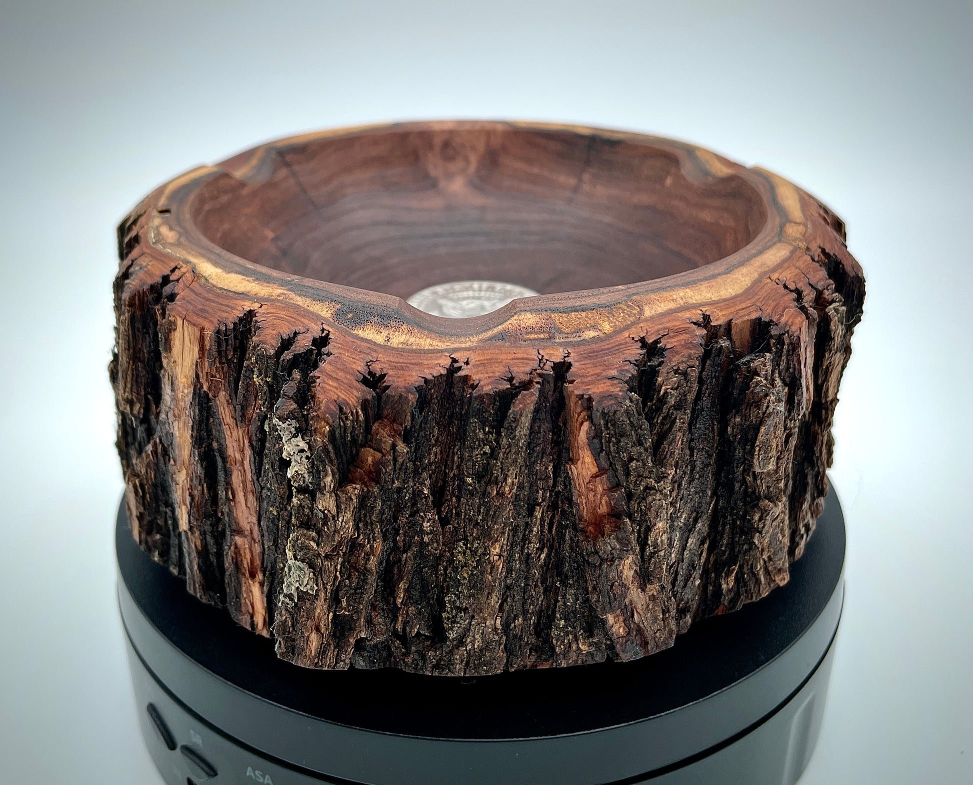 This stunning Mesquite Ashtray, with its bark-on feature and beautiful grain and color, makes for a perfect addition to any room. The unique design includes a fifty cent piece for extinguishing your smokes, adding a touch of character and functionality. Standing at 2.5" tall and 6" wide, it's a must-have for any ashtray collector.