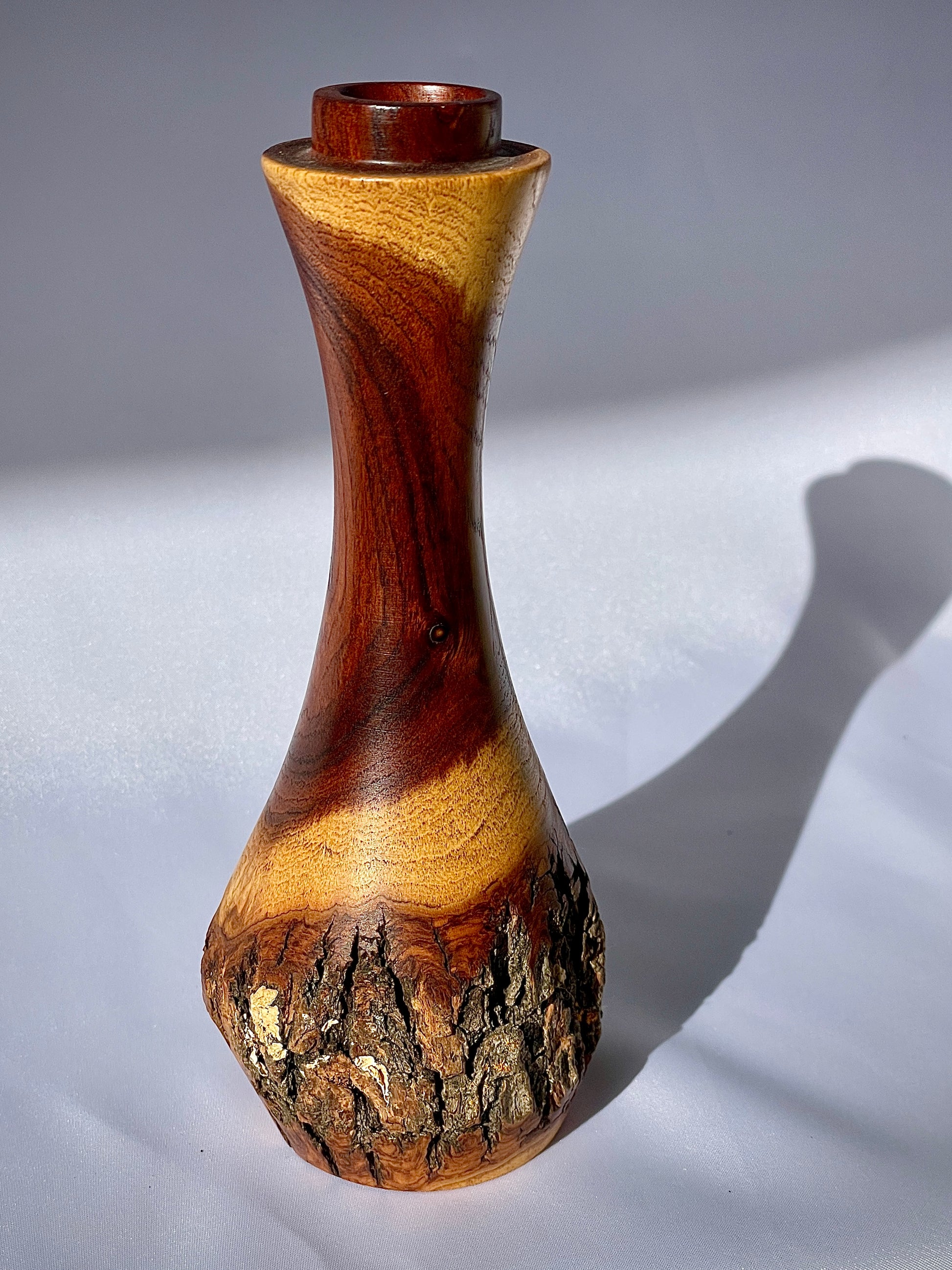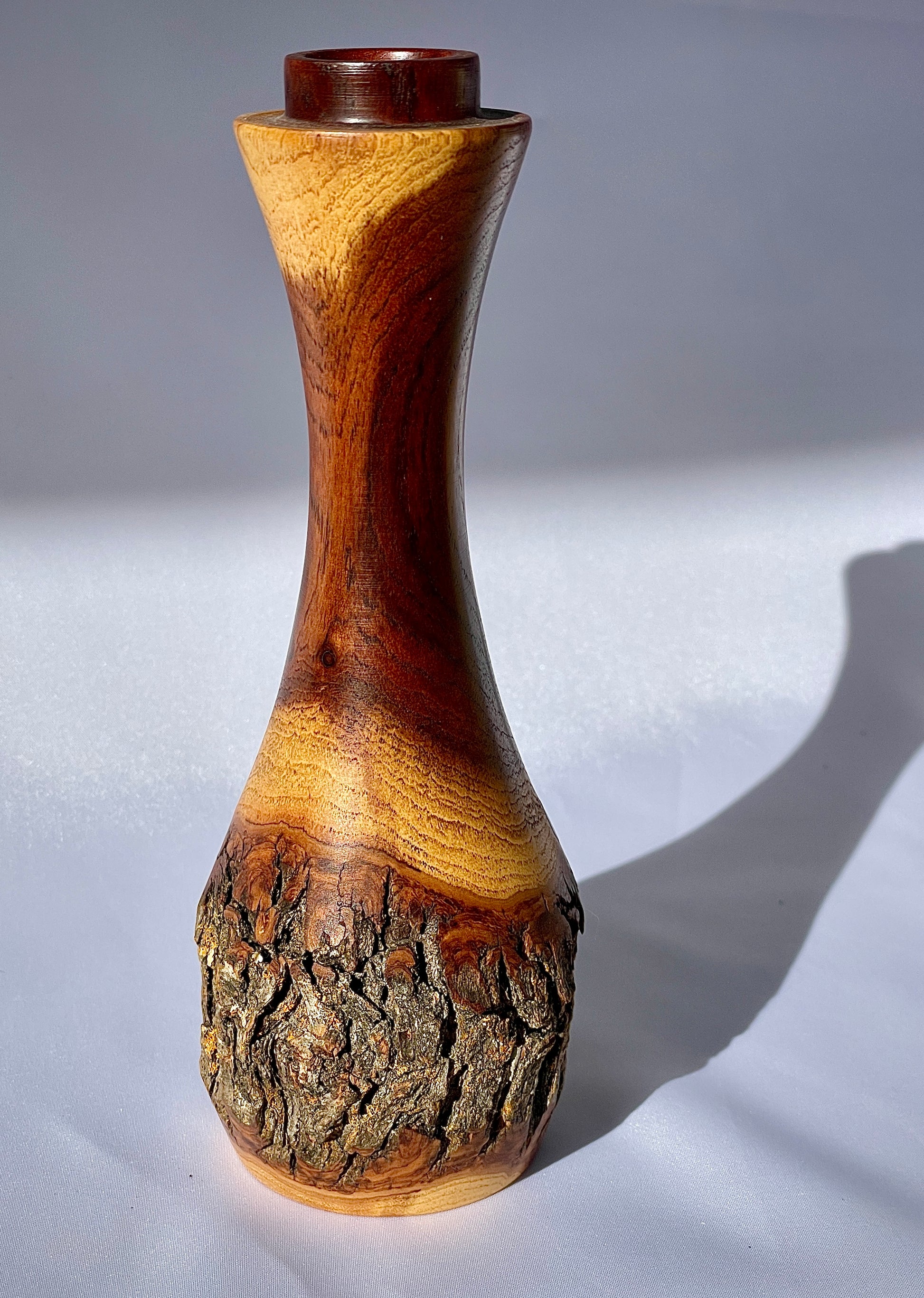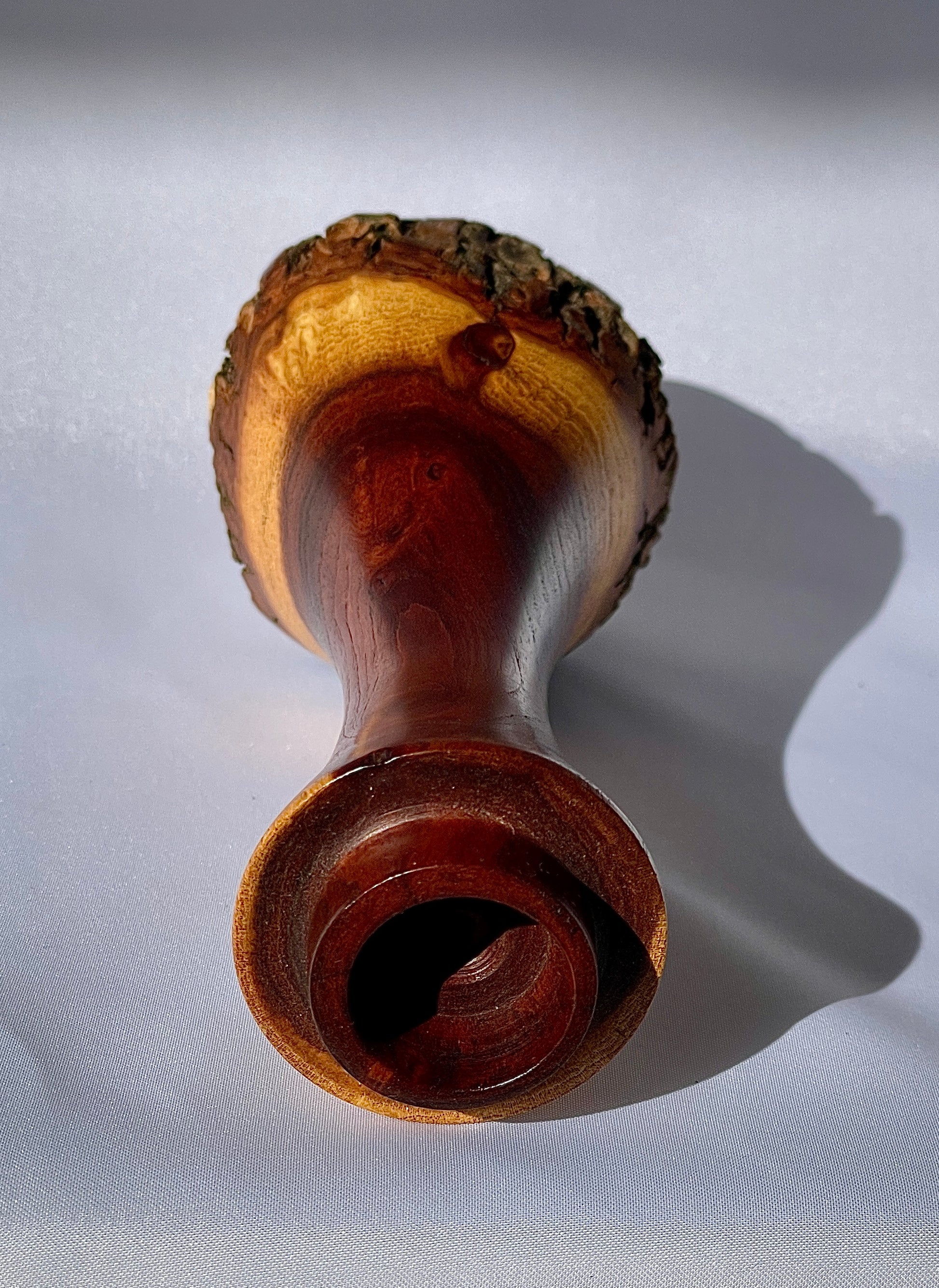 Illuminate your space with the warm glow of our Mesquite Candle Stick. The live edge base adds a unique touch while the 6.75" height and 2.5" width make it a perfect accent piece. With a 7/8" candle hole. Embrace the rich, dark color for a cozy and inviting atmosphere.