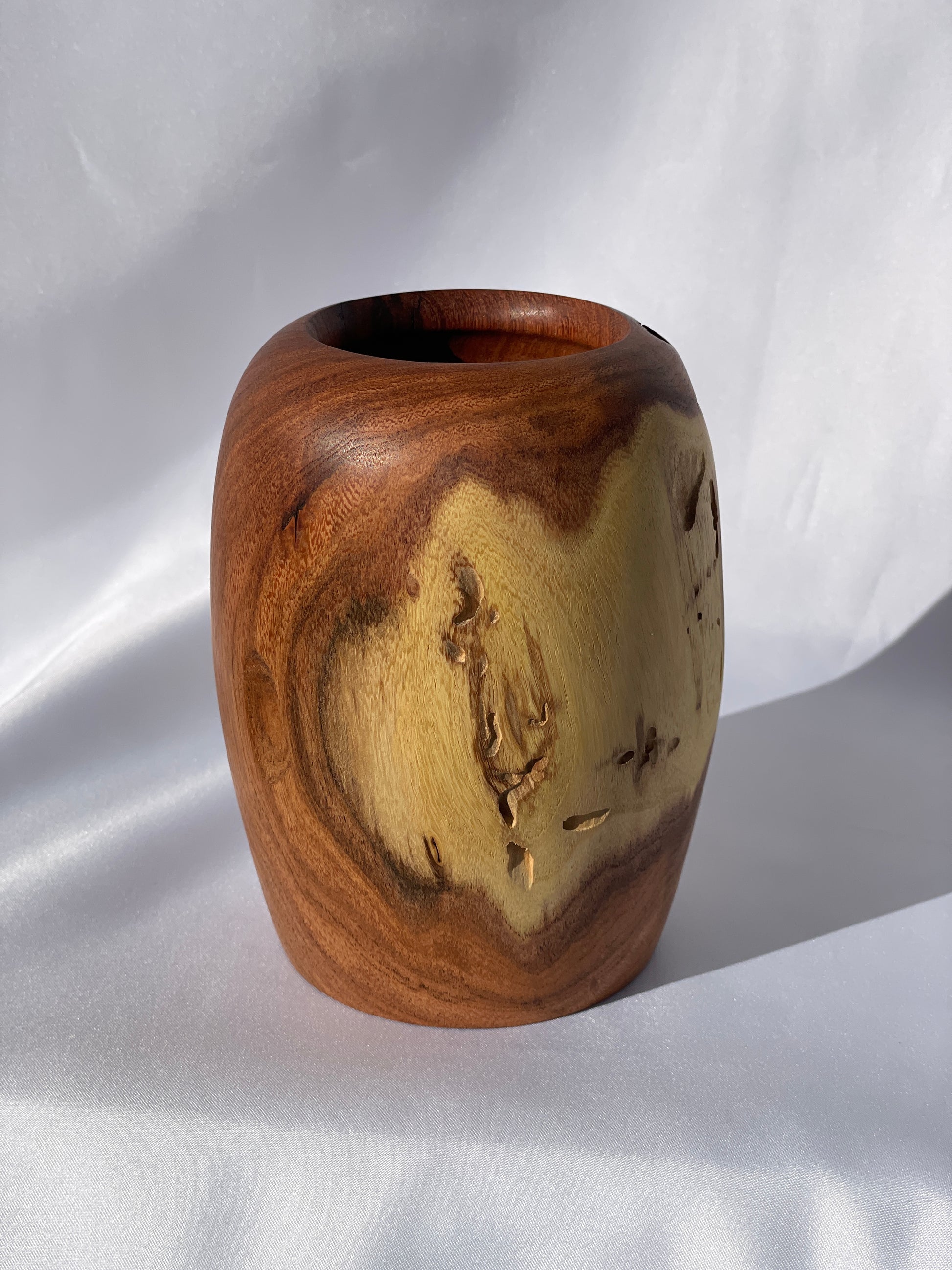 This mesquite natural sided vase boasts a unique, natural edge side and stands 5" tall by 3.75" wide. Its versatile design allows it to be used as a standalone piece or to hold your favorite flowers. Elevate your home decor with this beautiful and functional vase.