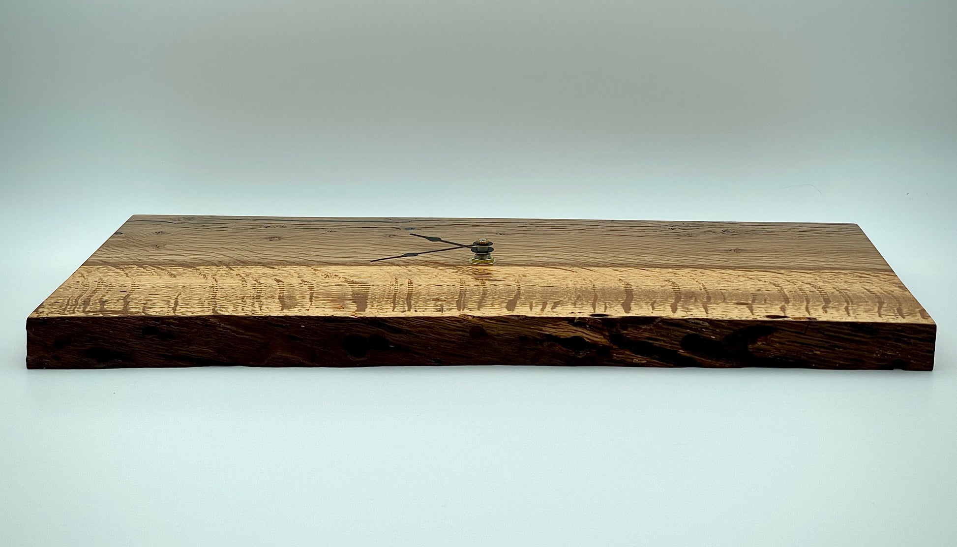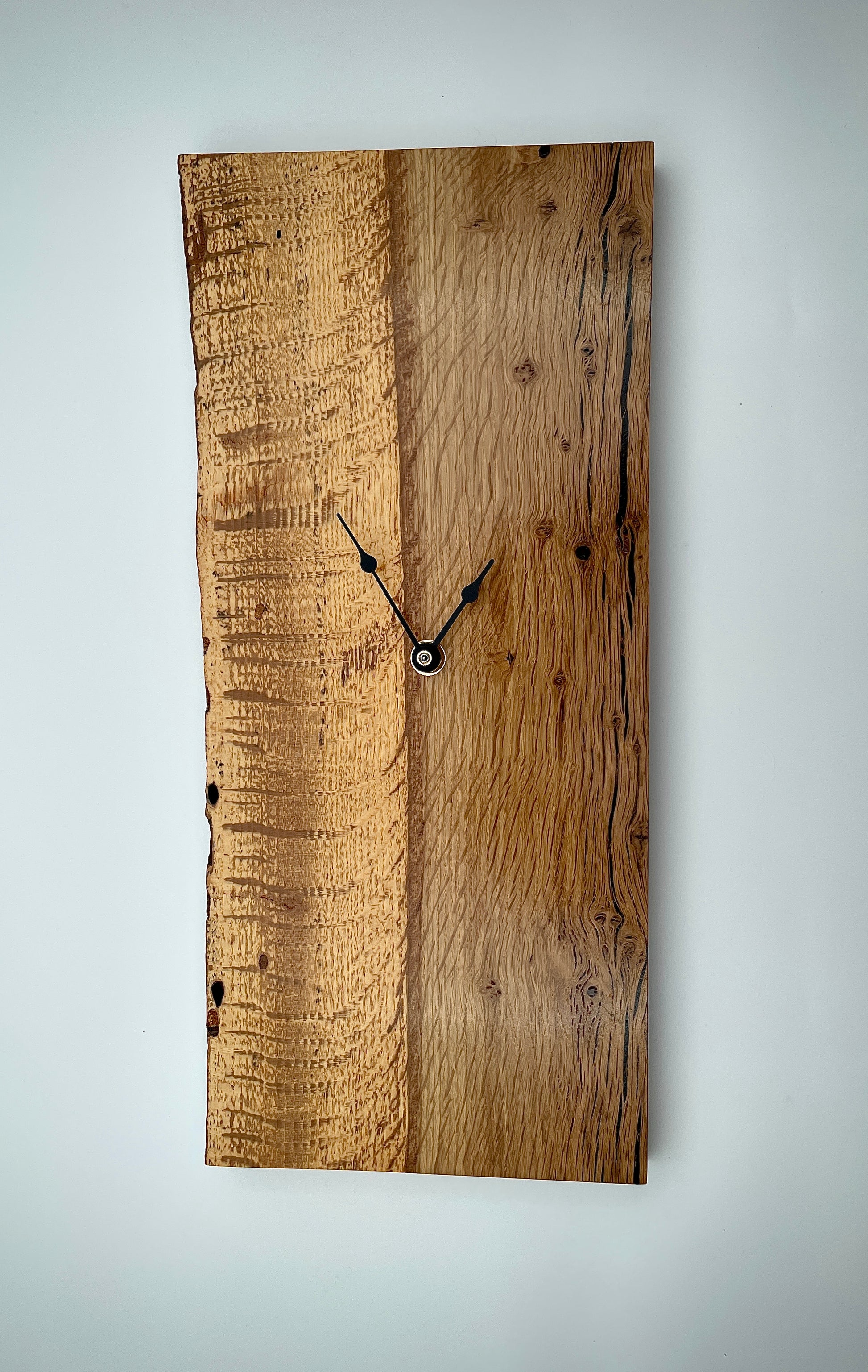 This stunning Oak wall clock showcases a beautifully contrasting grain and a natural edge on the top. Measuring at 15” wide by 7” tall and 1” thick, it will not only keep time but also add a touch of natural beauty to any home or office.