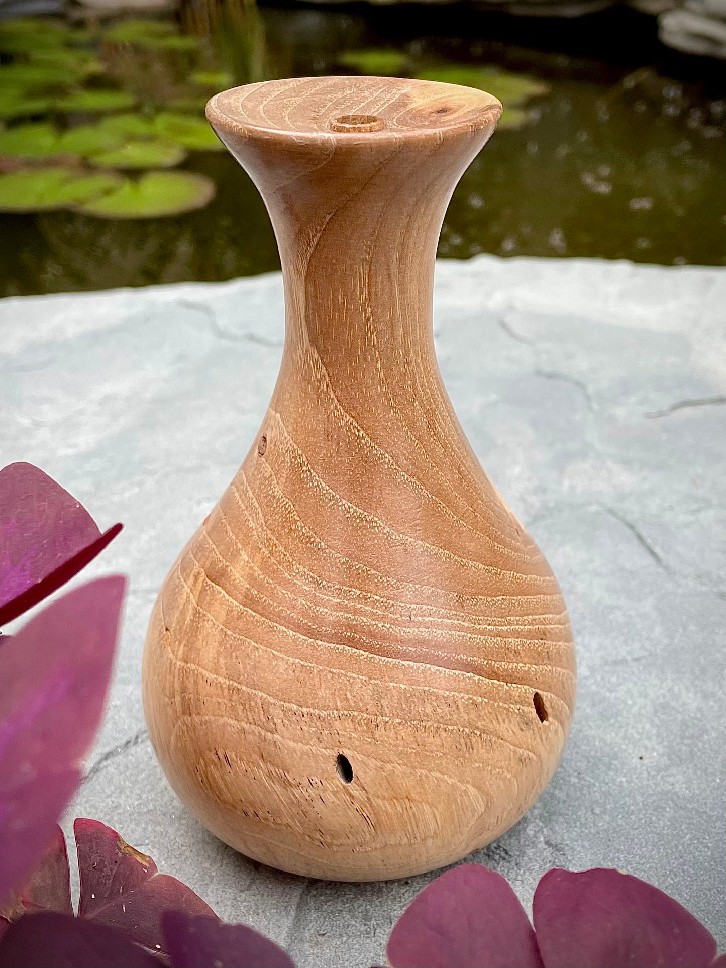 Experience the beauty of nature with our Pecan Bud Vase. Standing 5.5 inches tall and 3 inches wide, the pecan grain adds a touch of rustic elegance to any room. Simply add a dried flower or decorative twig for a charming and unique display.