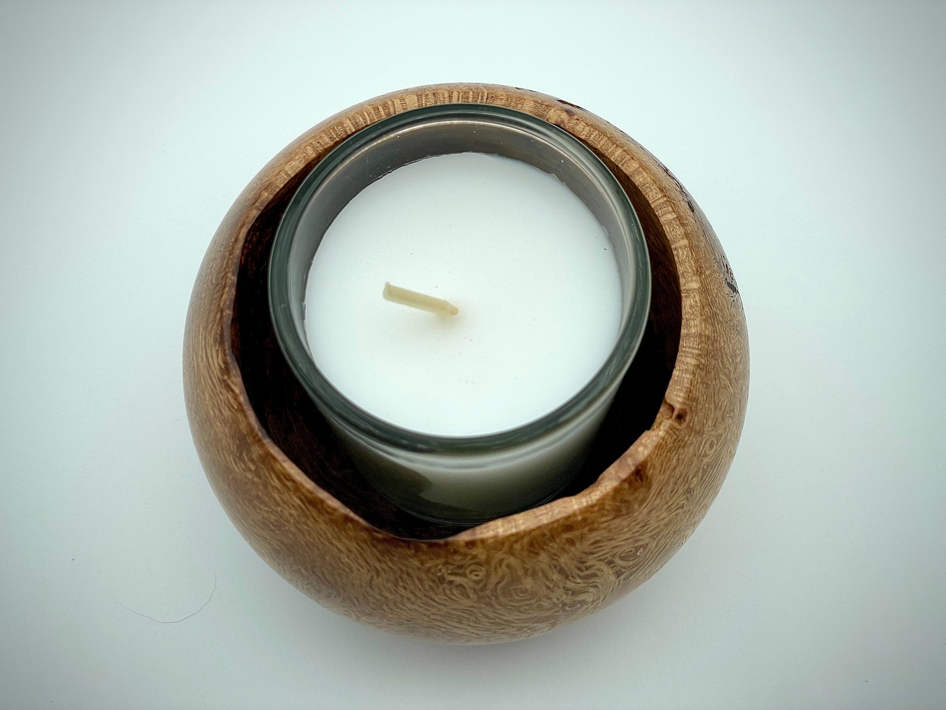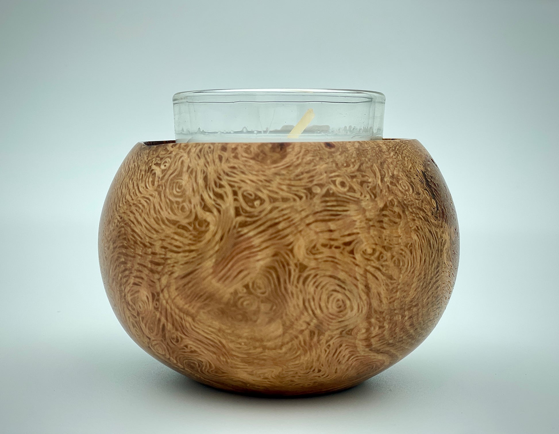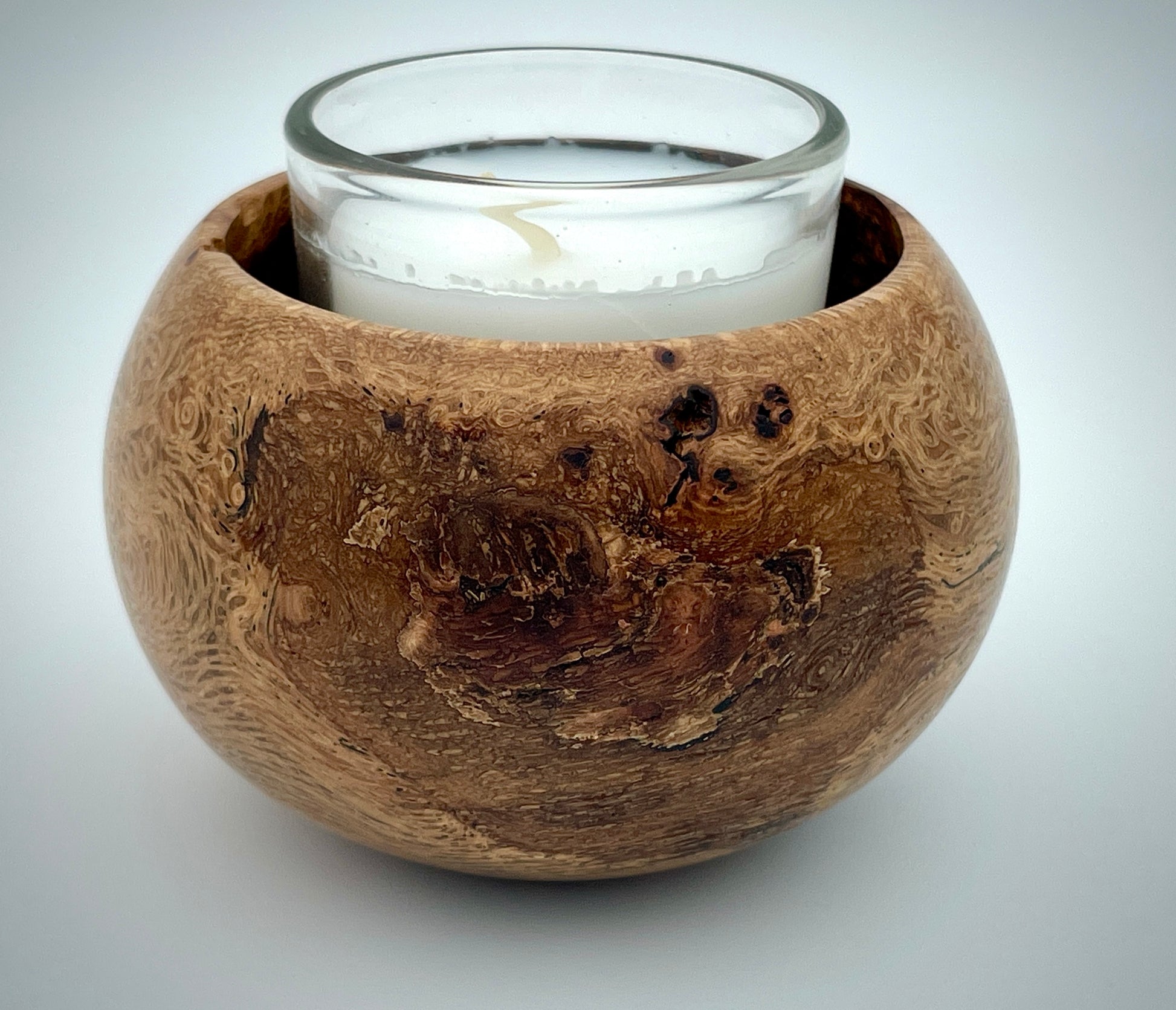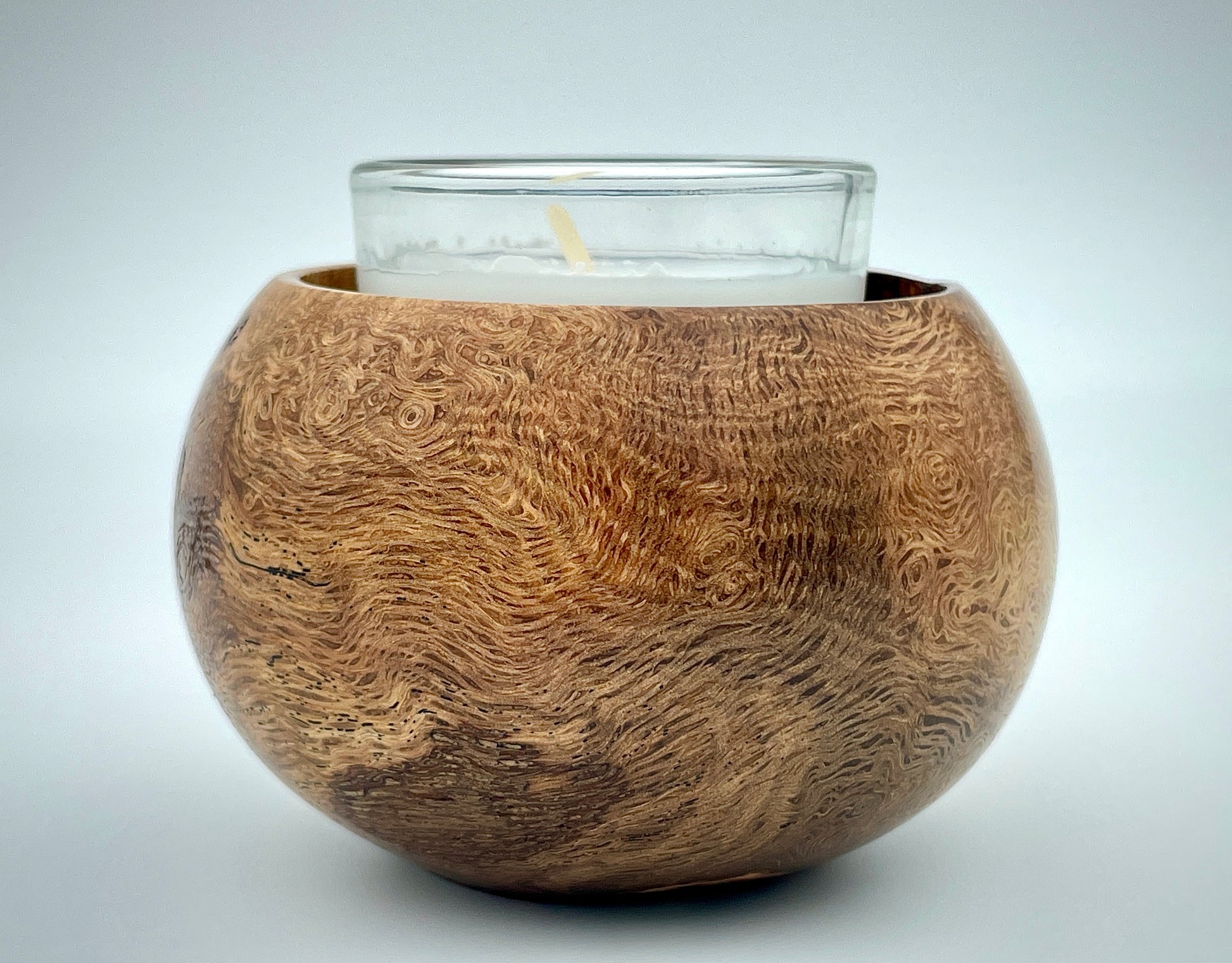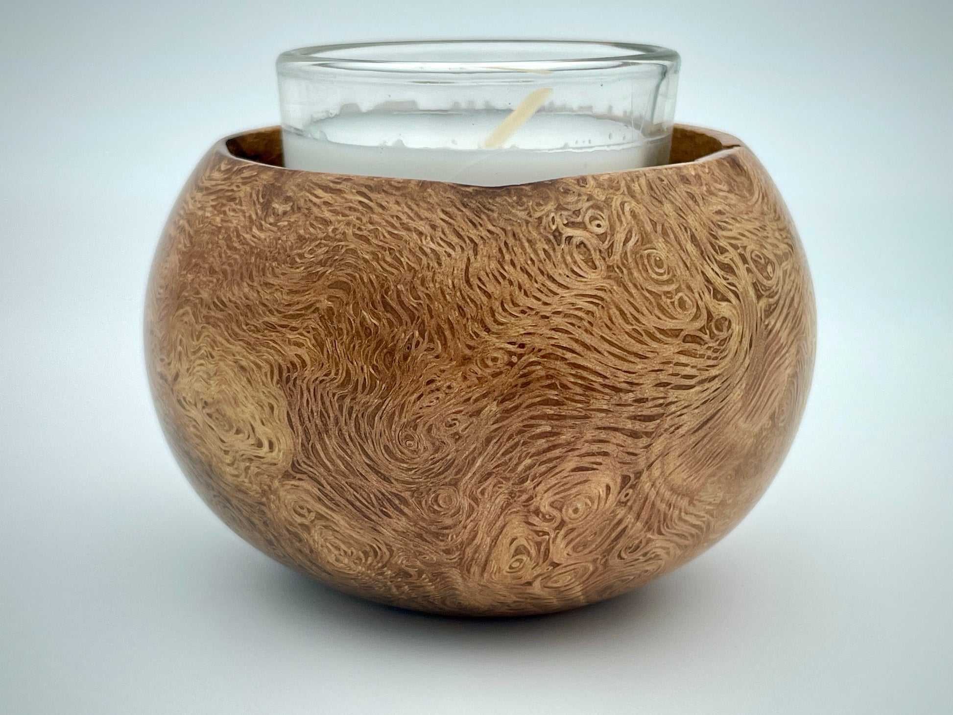This stunning oak burl votive candle is not only a beautiful decor piece, but its stunning grain adds a touch of nature to any space. Standing at 2.5 inches tall and 3.5 inches wide, it is the perfect size for any room. Bring warm, inviting light to your home with this perfect addition!